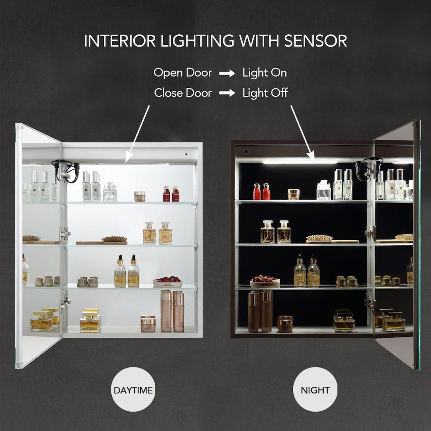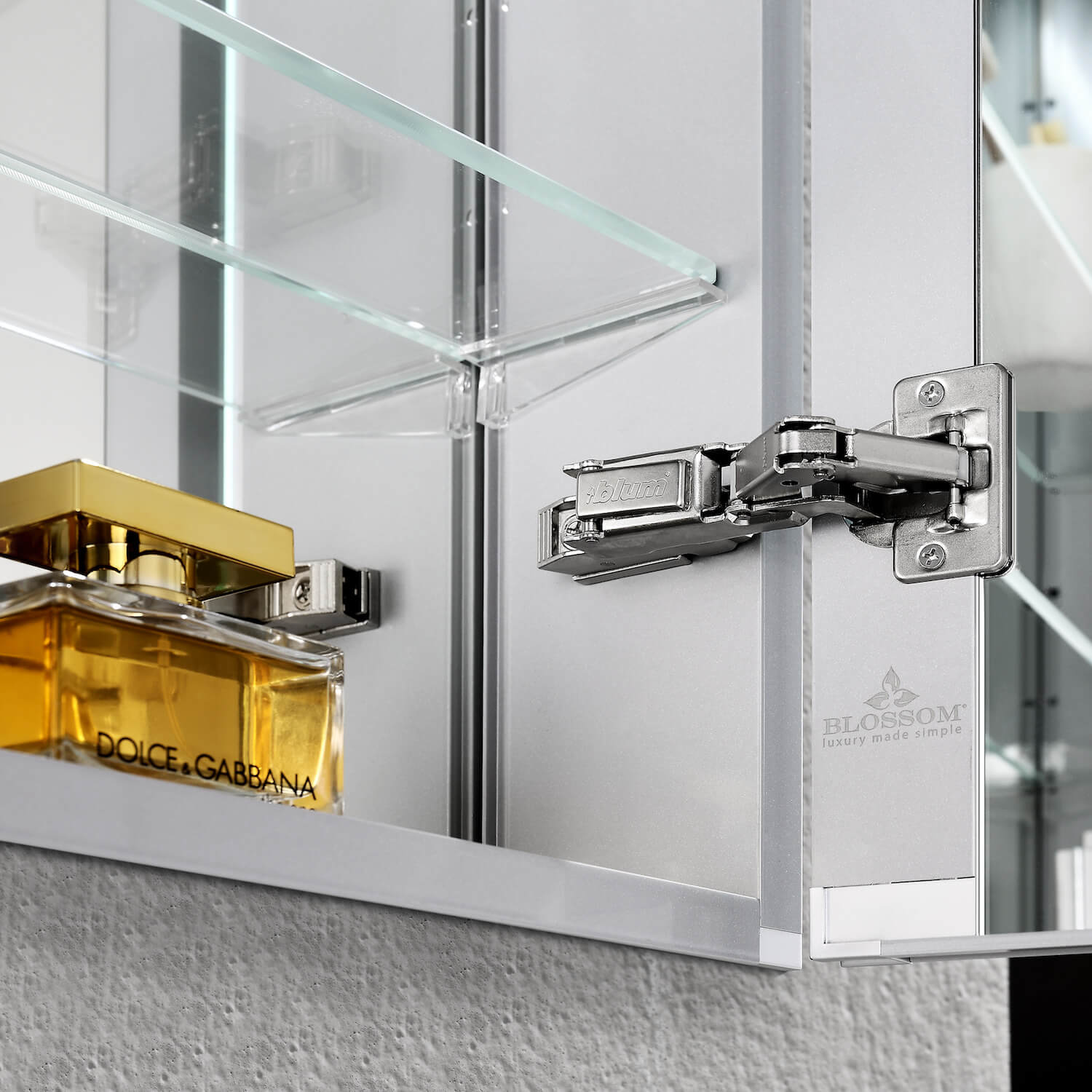 A: Single mirrored door with 3 adjustable 8 mm tempered-glass shelves inside.