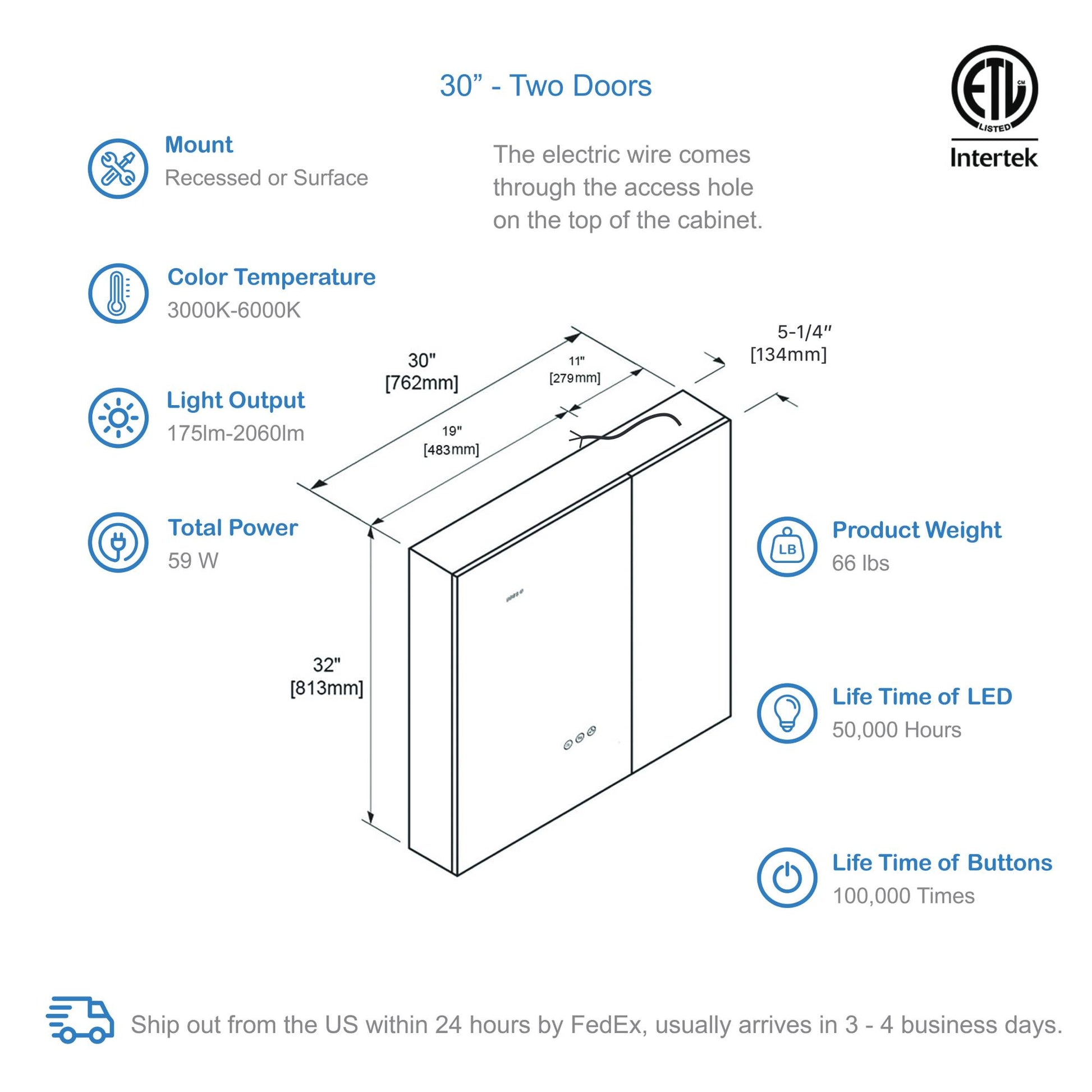 Blossom Sirius – 30 Inches LED Medicine Cabinet with Clock - MCL3 3032