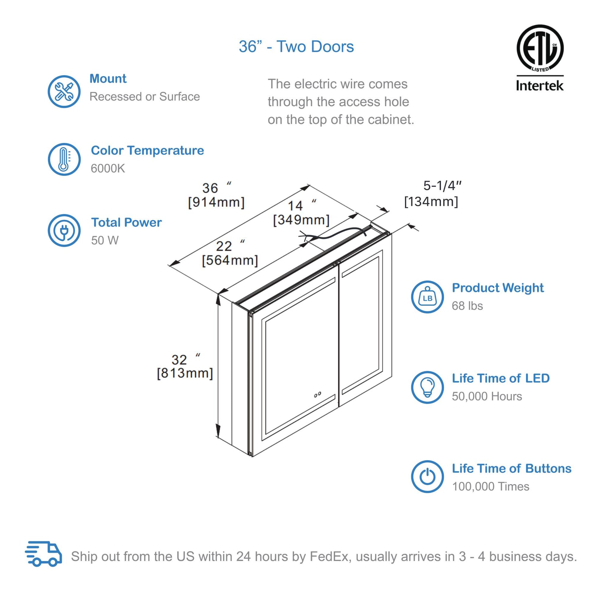 A: 36″ W × 32″ H × ~5.25″ D. Supports surface-mount or recessed mounting.