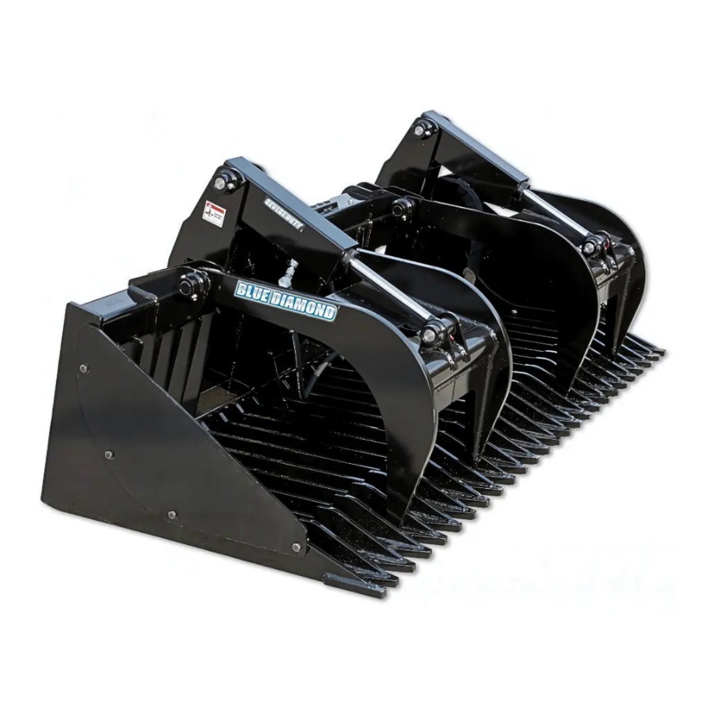 The Blue Diamond Severe Duty Skid Steer Rock Grapple Bucket is engineered for ultimate durability with 1/2” steel tines spaced at 3”. Ideal for sifting, raking, and leveling, it features dual grapples for secure material handling. Its unique design includes no pinch hose routing, removable bolt-on sides for log moving, and an enhanced cutting edge for superior leveling.