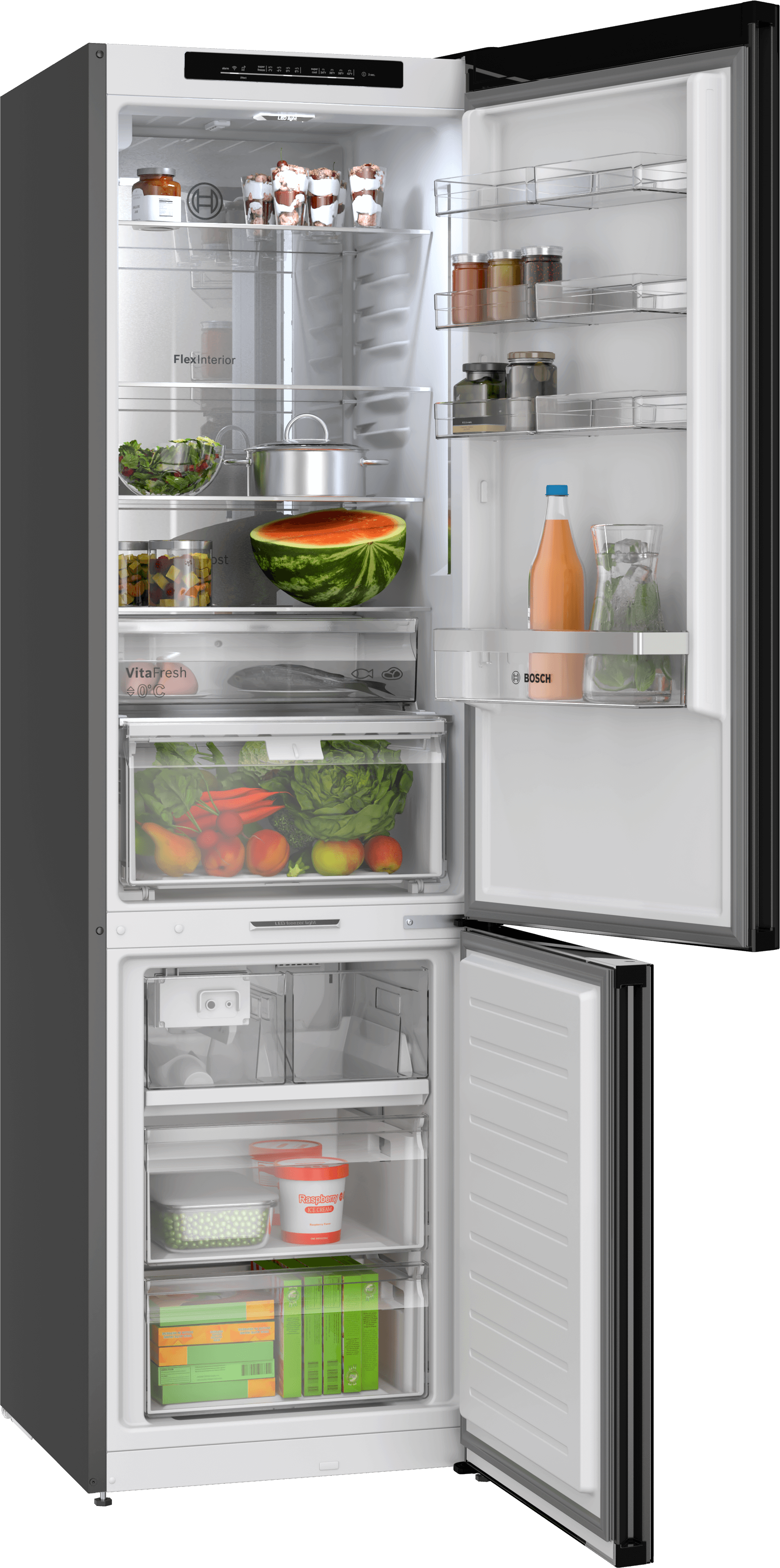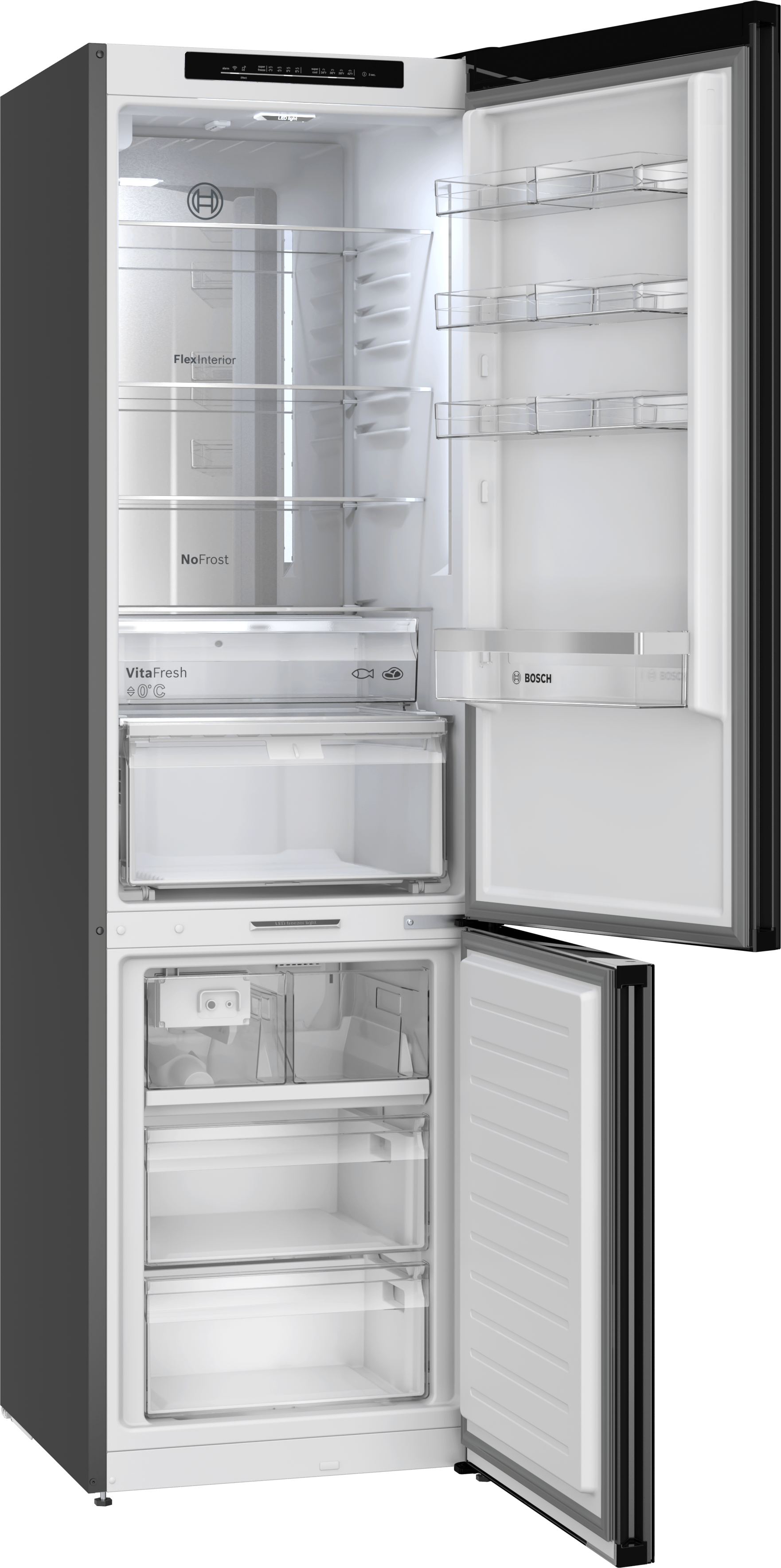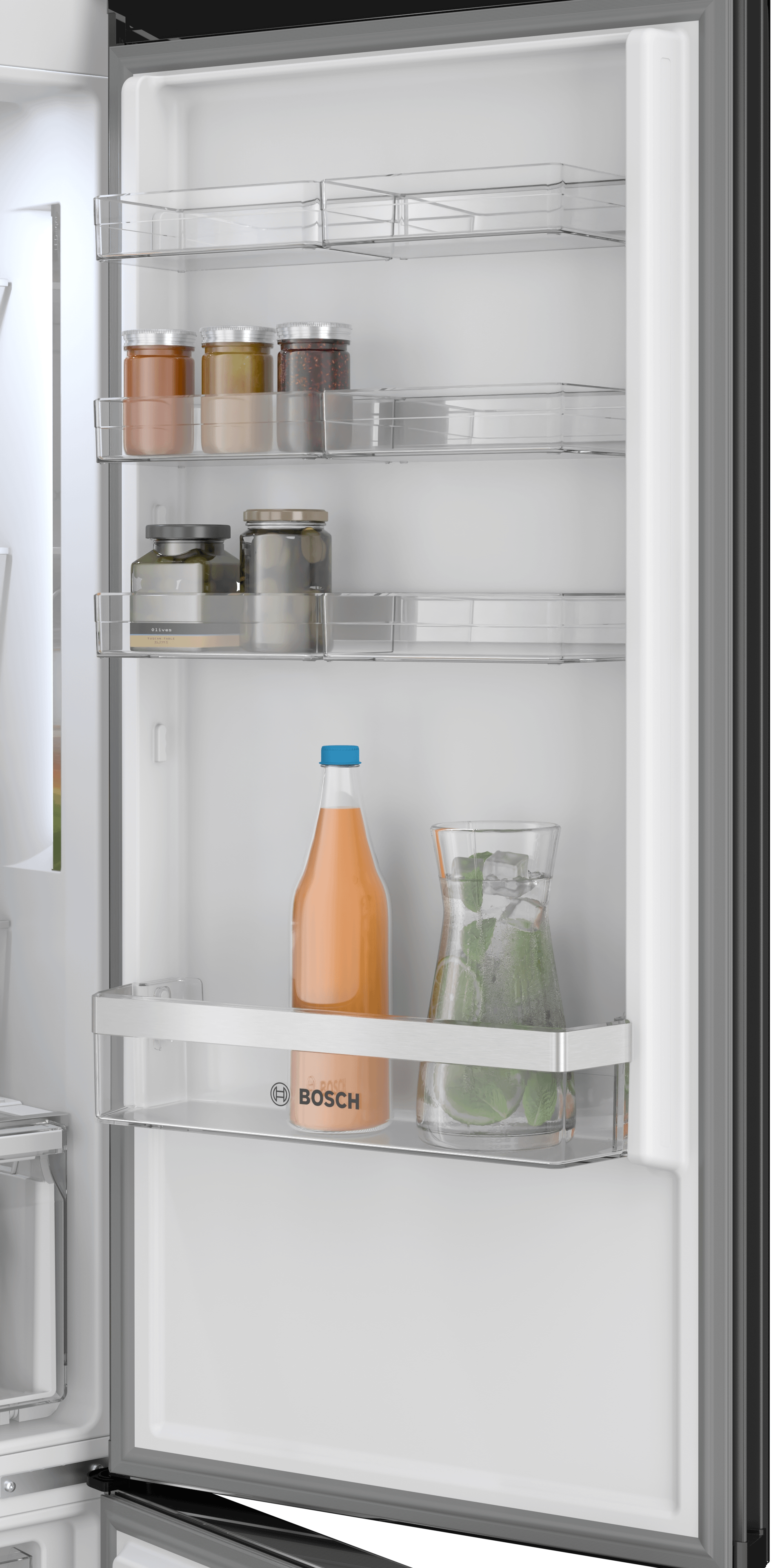 The Bosch B24CB80ESB is a premium 24-inch counter-depth freestanding bottom freezer refrigerator that combines innovative features with a contemporary black glass design. With a total capacity of 12.8 cu. ft., it provides ample storage space while maintaining a compact footprint suitable for urban kitchens. The refrigerator compartment offers 9.2 cu. ft. of space, featuring adjustable glass shelves and door bins to accommodate various food items. The freezer compartment provides 3.6 cu. ft. of storage, complete with an automatic ice maker that ensures a steady supply of ice. Equipped with the MultiAirFlow™ system, it maintains consistent temperatures throughout the unit by evenly circulating cool air, preserving the freshness of your groceries. The VitaFresh™ drawer offers adjustable humidity, creating the optimal environment for fruits and vegetables, keeping them fresh longer. An internal water dispenser provides easy access to filtered water, thanks to the UltraClarityPro® water filter that removes over 99.9% of sediments, including harsh elements like chlorine and chloramine. The refrigerator is Wi-Fi enabled with Home Connect®, allowing you to remotely monitor and control your appliance via a smartphone app. Additional features include LED lighting for clear visibility, a door ajar notification system that alerts you if the door is left open, and ENERGY STAR® certification, ensuring energy-efficient performance.