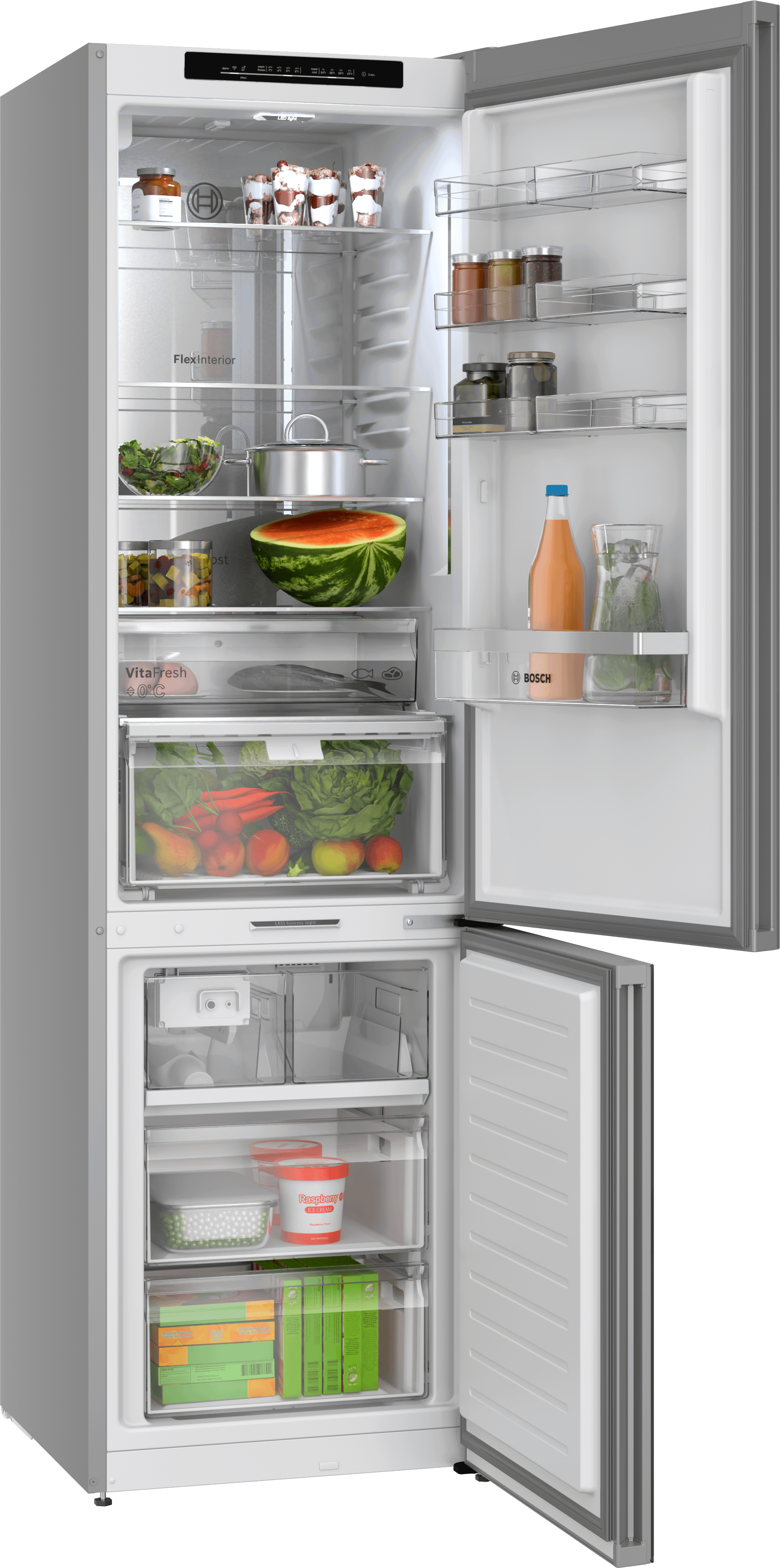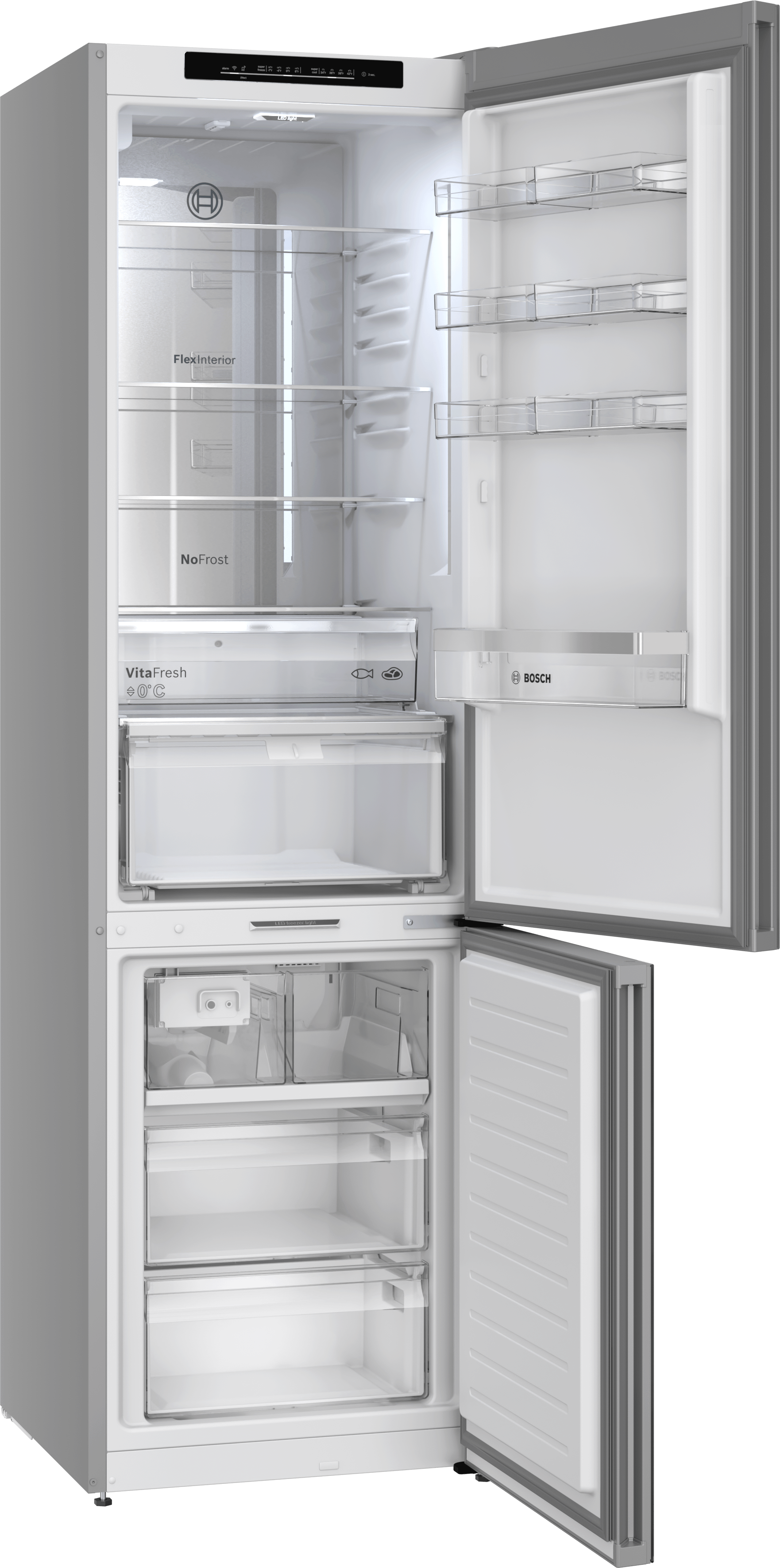 Bosch 800 Series 24" free-standing fridge-freezer offers efficient, organized storage with Total No Frost technology.