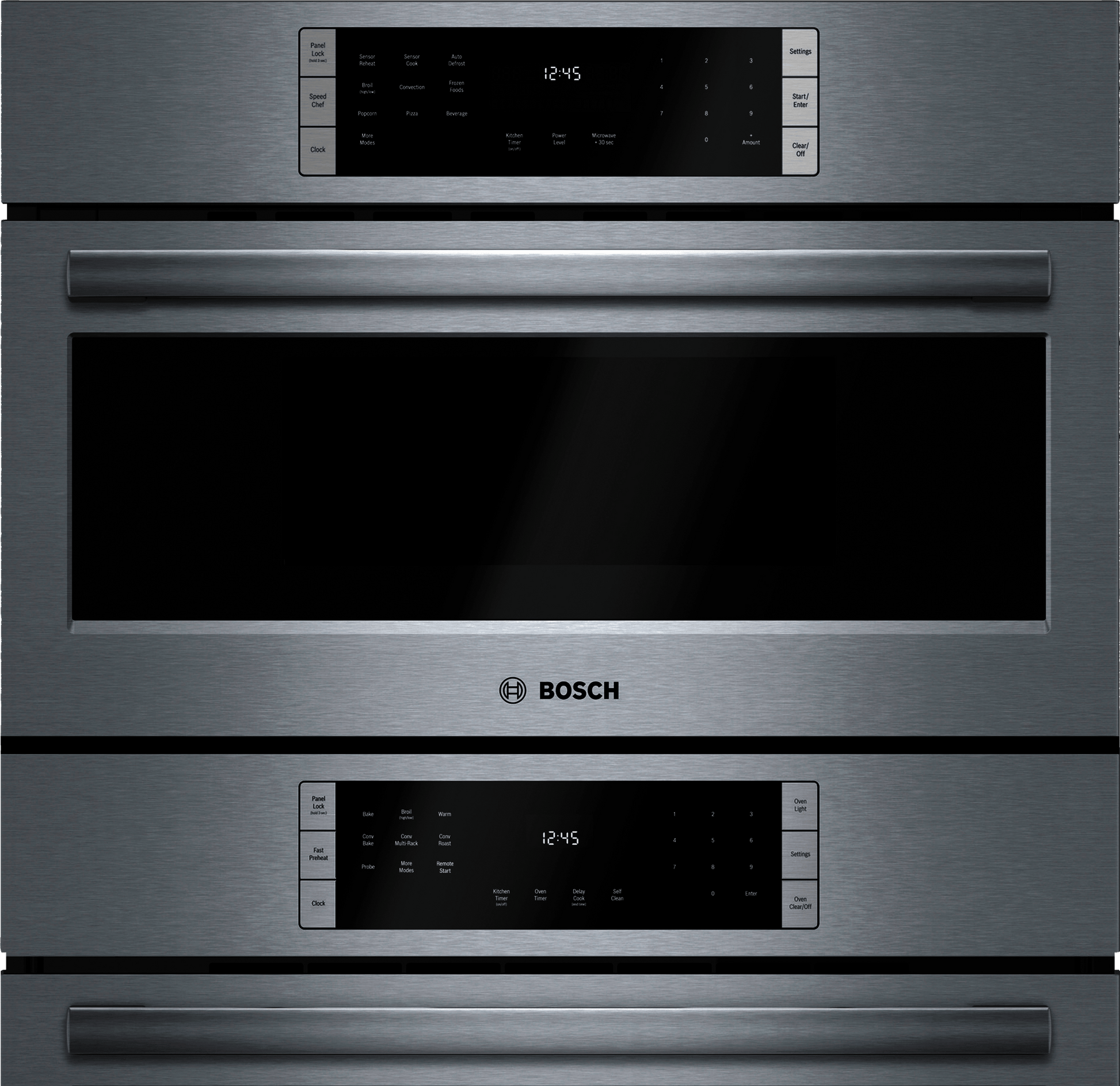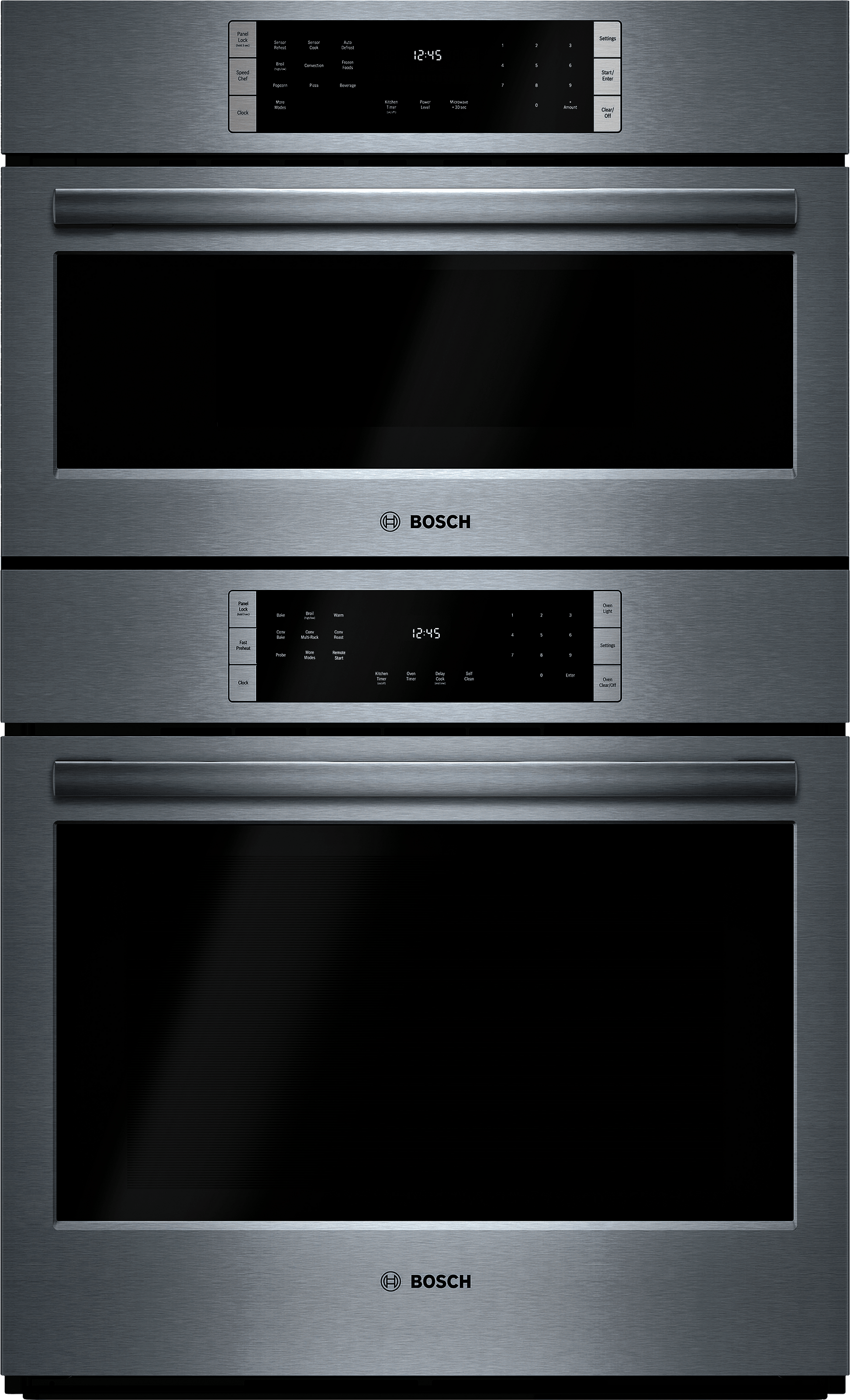 The Bosch HBL8753UC combination wall oven combines a speed oven and a convection oven to provide a comprehensive cooking solution. The upper speed oven functions as both a microwave and convection oven, offering 9 SpeedChef® programs that simplify cooking with fast results. The lower convection oven features Genuine European Convection with 3D HotAir Technology, ensuring even heat distribution for consistent baking and roasting across multiple racks. With a total capacity of 6.2 cu. ft. (1.6 cu. ft. upper; 4.6 cu. ft. lower), it accommodates various dish sizes. The oven is equipped with Home Connect™, allowing remote monitoring and control via a smartphone or tablet. Additional features include a self-cleaning function with multiple cycle options, a telescopic rack for safe access, and a temperature probe for precise cooking. The stainless steel finish and SteelTouch™ control panel enhance its modern aesthetic.