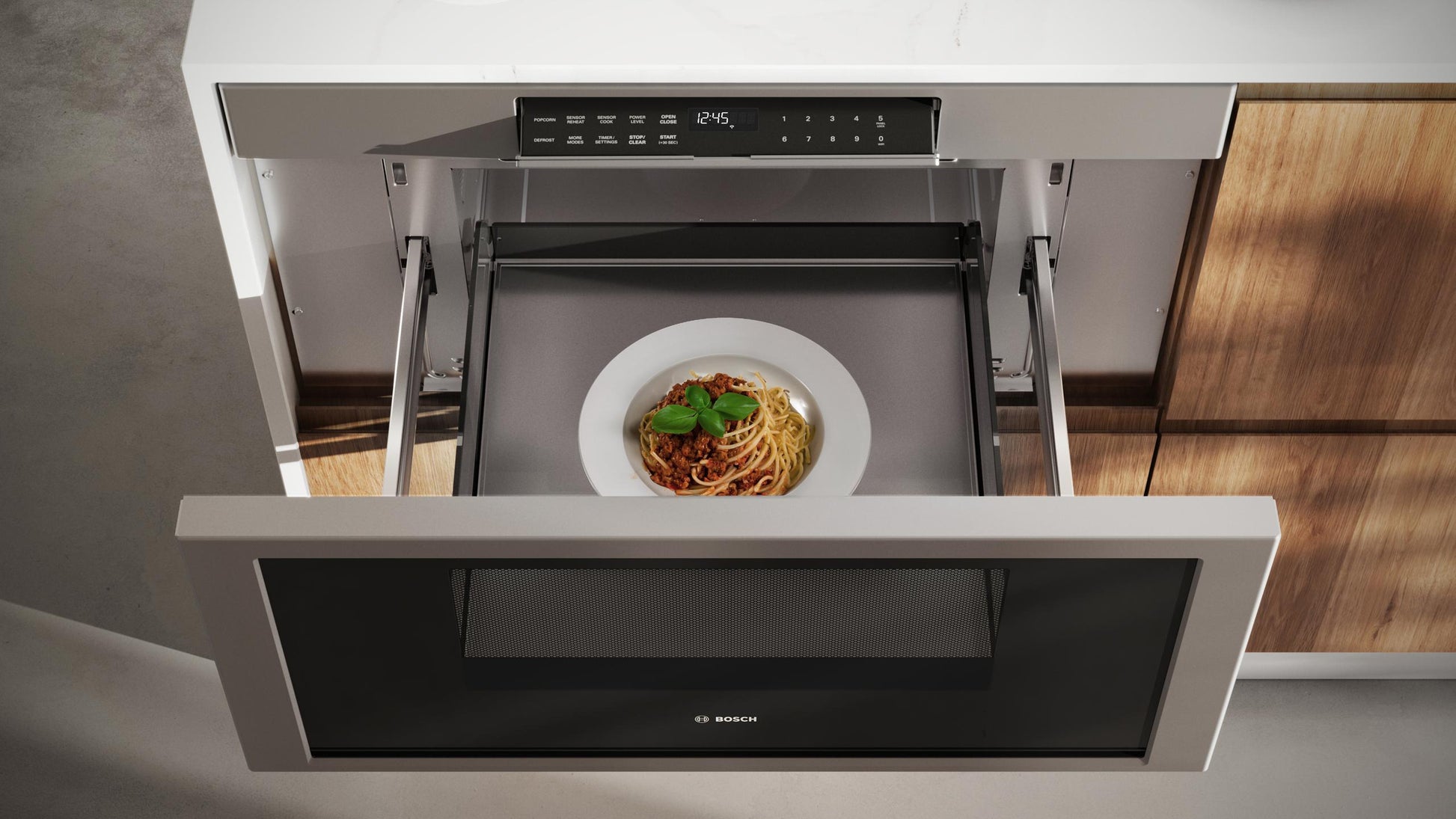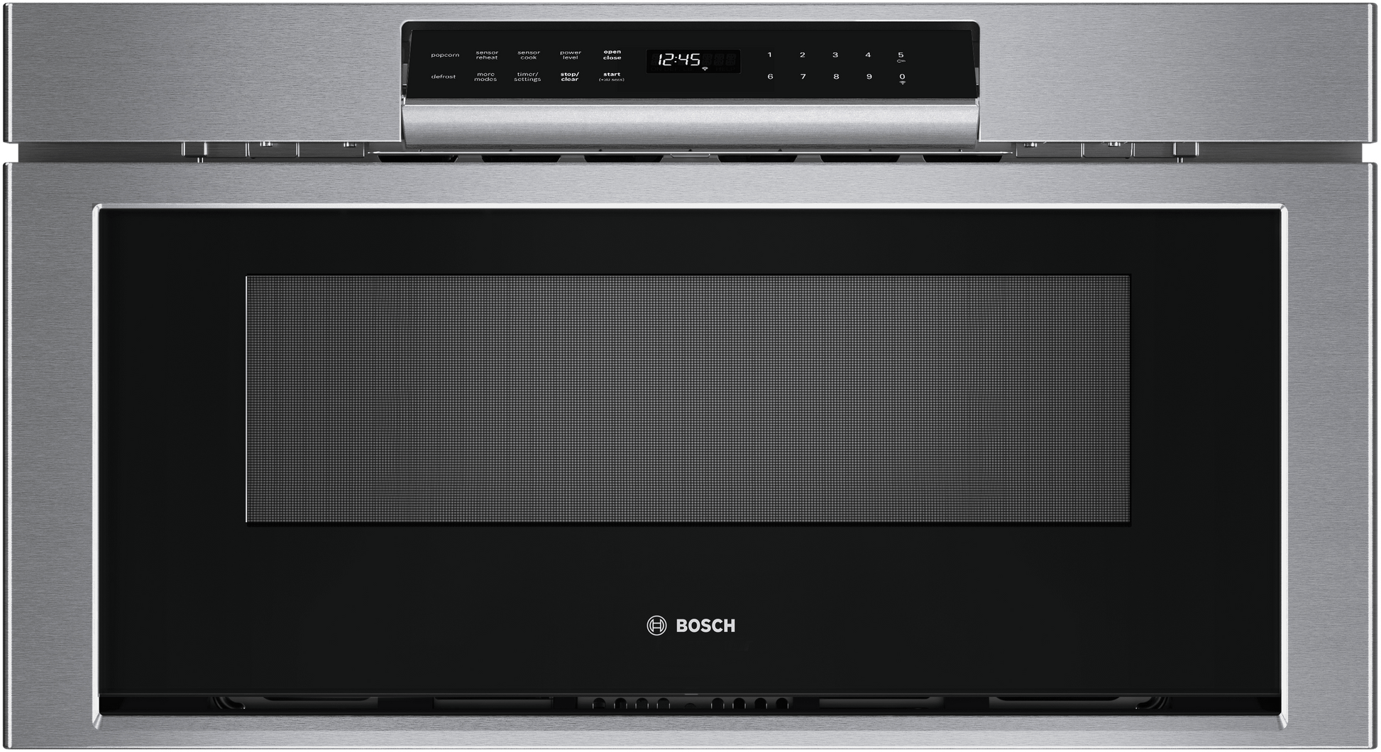 The Bosch HMD8054UC 800 Series 30-inch drawer microwave combines style, convenience, and advanced functionality for a seamless cooking experience. Its stainless steel finish adds a polished, professional touch, while the drawer design allows for smooth, under-counter installation, saving valuable countertop space.
