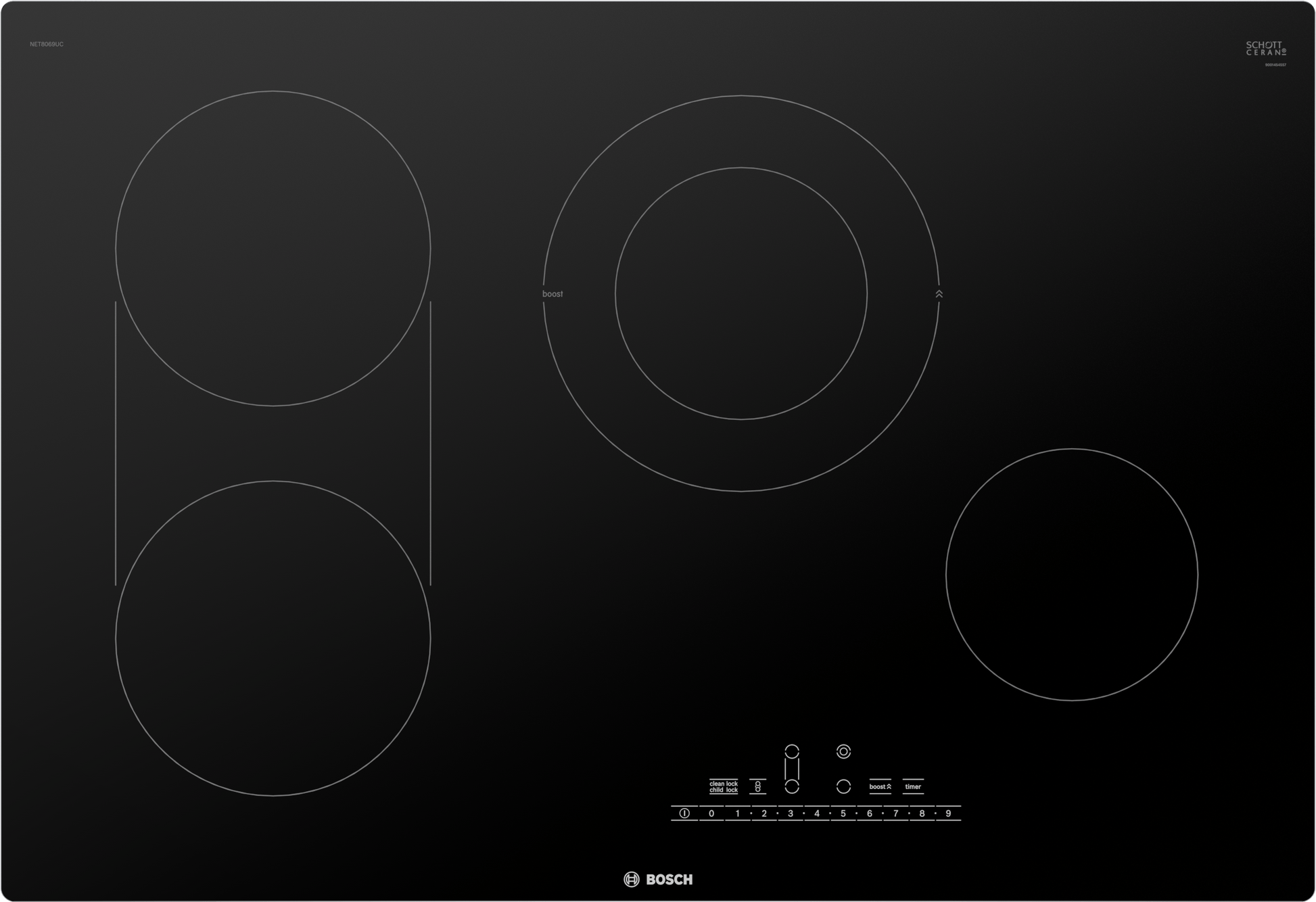 The Bosch NET8069UC is a premium 30-inch electric cooktop that combines advanced features with a minimalist, frameless black design, seamlessly integrating into contemporary kitchen aesthetics. It features four radiant heating elements, including a dual 9"/6" 3,600-watt power element, accommodating various pot and pan sizes for versatile cooking. The Bridge Element allows you to combine two cooking zones into one larger zone, providing flexibility for griddles or large cookware. With SpeedBoost®, this cooktop offers shorter heat-up times for liquids, enabling rapid boiling and efficient cooking. The PreciseSelect® feature provides 17 different direct cooking level settings, allowing for accurate and consistent temperature control. The smooth ceramic glass surface not only enhances the cooktop's sleek appearance but also makes cleaning especially easy. Safety features include a ChildLock to prevent accidental activation, a CleanLock function that prevents unwanted changing of settings while cleaning spills, and a two-level heat indicator that warns if the cooktop is warm or hot. Additionally, each zone's timer automatically shuts off when cooking is done, providing added safety and convenience.