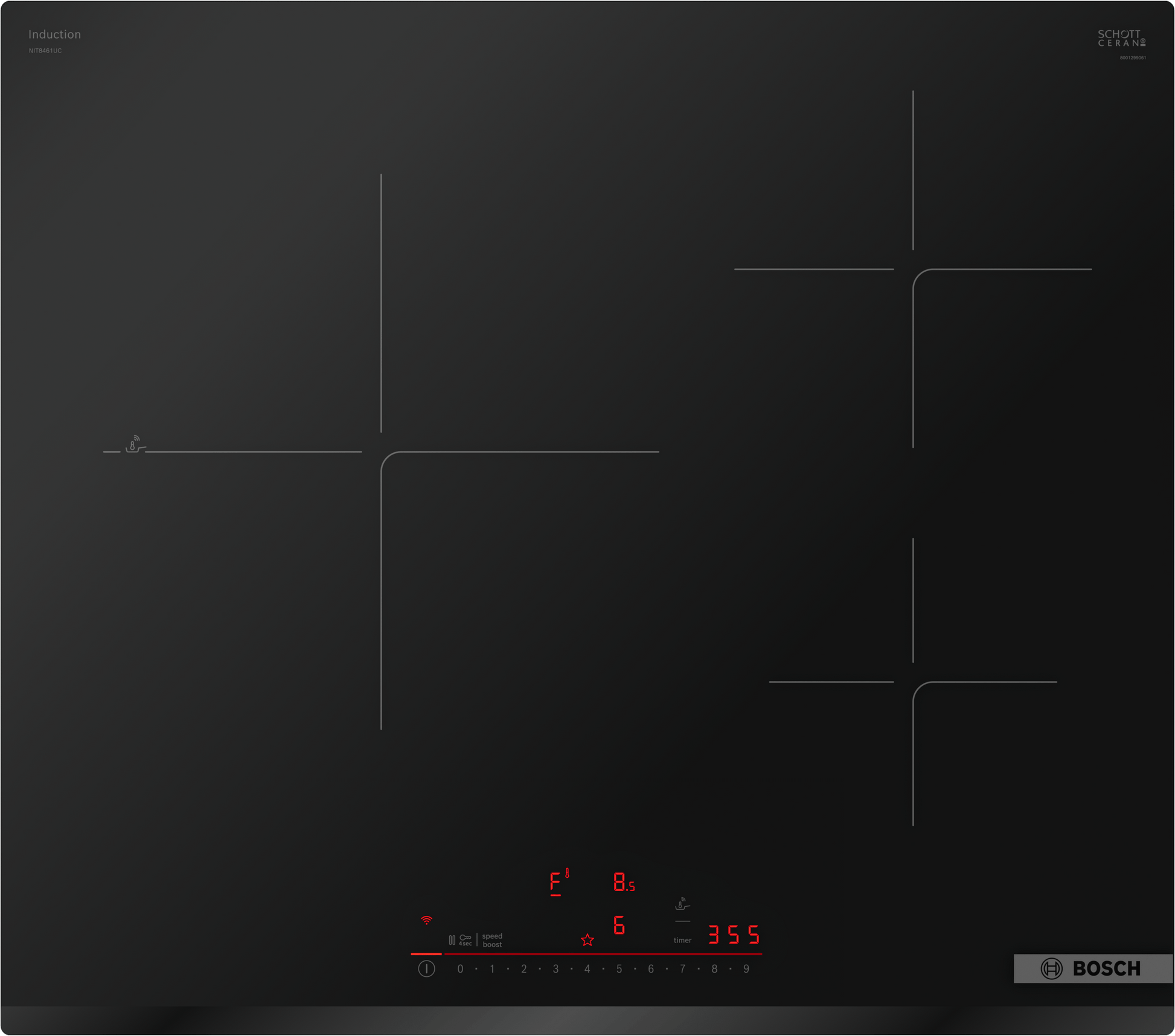 Bosch 800 Series 24" induction hob provides precise, energy-efficient cooking with a sleek black surface.