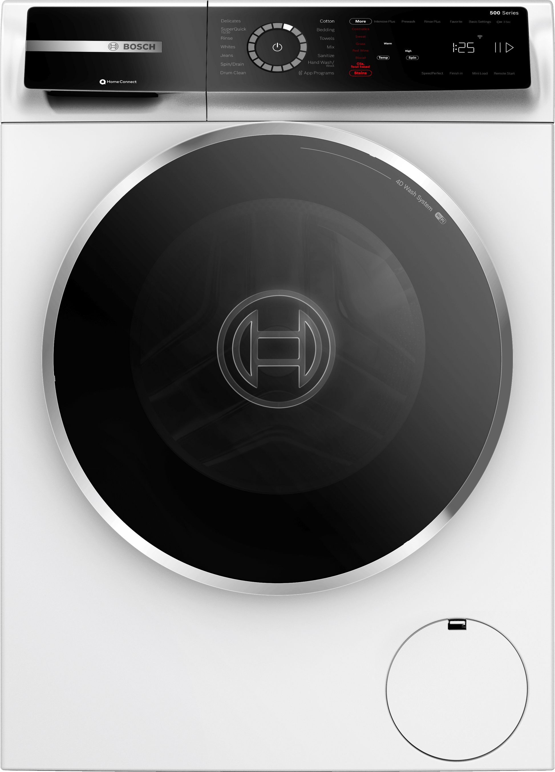 Bosch 500 Series front-load washing machine delivers powerful, efficient cleaning with 1600 RPM spin speed.