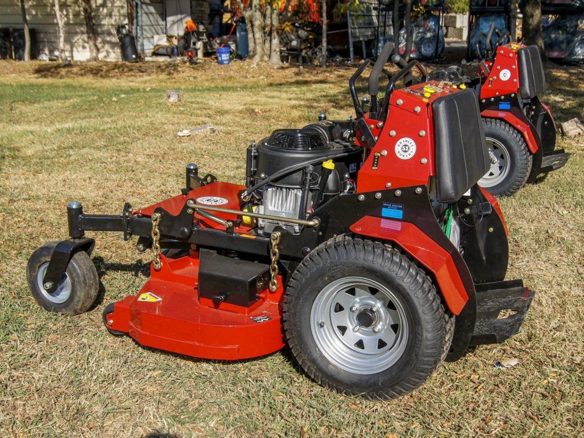 The Bradley 48SC-CT25 compact ZT stand-on mower features a 48-inch wide fabricated floating mowing deck and a 25-horsepower Briggs and Stratton engine.