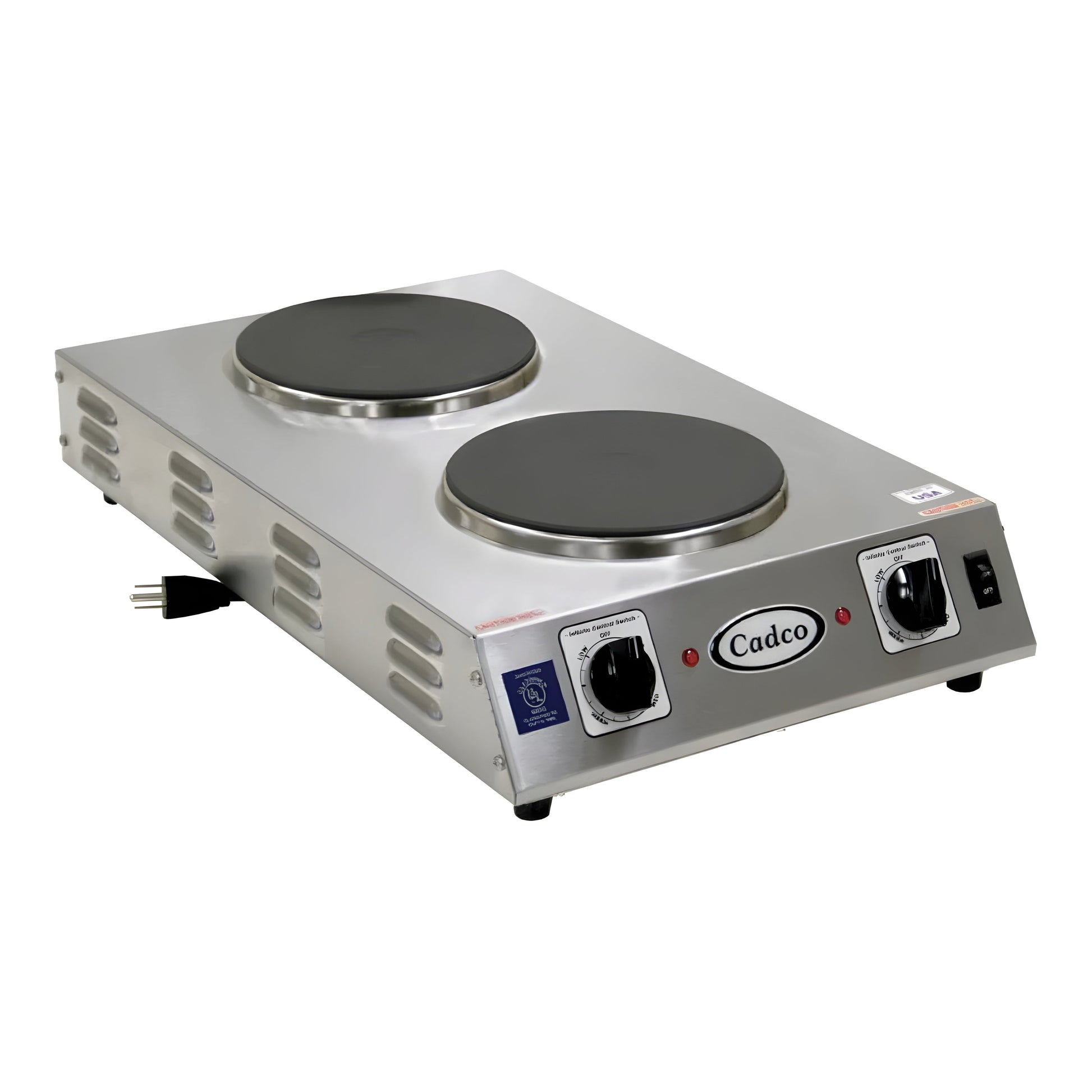 The Cadco CDR-2CFB is a reliable and efficient double burner electric hot plate, designed for both commercial and residential kitchens. Featuring two 7 1/2-inch cast iron elements, this hot plate provides a total cooking power of 1,800 watts, making it versatile enough for a wide range of cooking tasks, from sautéing to boiling. Its stainless steel construction ensures durability and easy cleaning, while the infinite control type allows for precise temperature adjustments, providing flexibility in cooking methods. With compact dimensions of 13 1/2 inches wide and 22 3/4 inches deep, this hot plate is ideal for countertop use, fitting seamlessly into any kitchen setup. Operating on 120 volts, it is perfect for standard outlets and features a NEMA 5-20P plug type for easy connectivity. This portable appliance is an excellent choice for chefs needing additional cooking capacity or for temporary setups like catering or food service events.