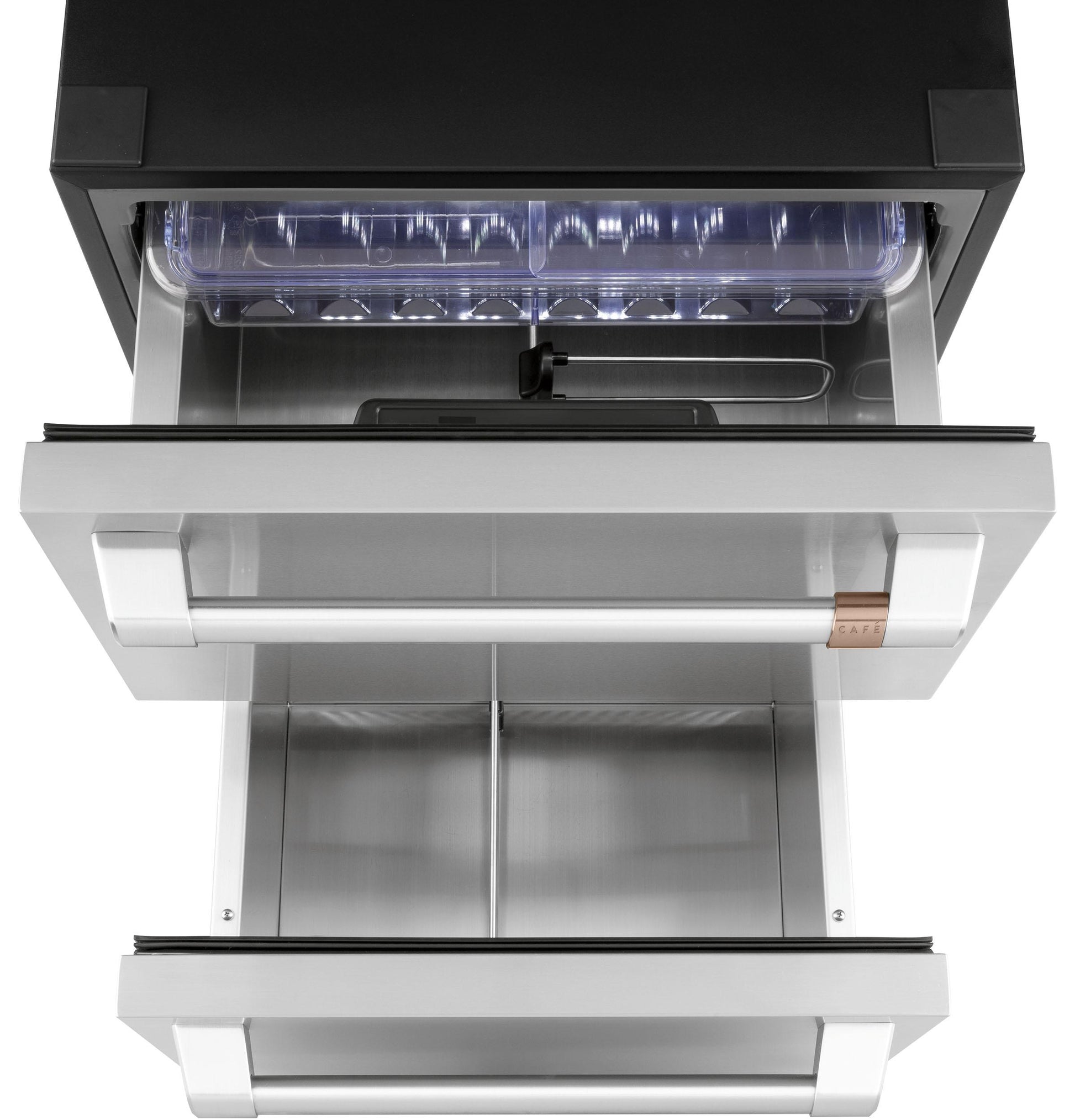The Café CDE06RP2NS1 24-Inch Built-In Dual-Drawer Refrigerator combines style and functionality to meet your refrigeration needs. Its stainless steel interior not only provides a premium look but also ensures durability and easy cleaning. The soft-close drawers are engineered for quiet and smooth operation, preventing any disruptions during use. Adjustable dividers in both drawers offer flexible storage options, allowing you to organize your fresh foods and beverages efficiently. The precise temperature control system maintains an optimal environment for your items, with settings ranging between 34°F and 45°F. Bright LED lighting illuminates the interior, making it easy to locate your favorite foods and drinks. With a total capacity of 5.7 cu. ft., this refrigerator comfortably accommodates upright bottles and various other items. Additional features include a door alarm to alert you if a drawer is left open and Sabbath Mode to accommodate religious observances.