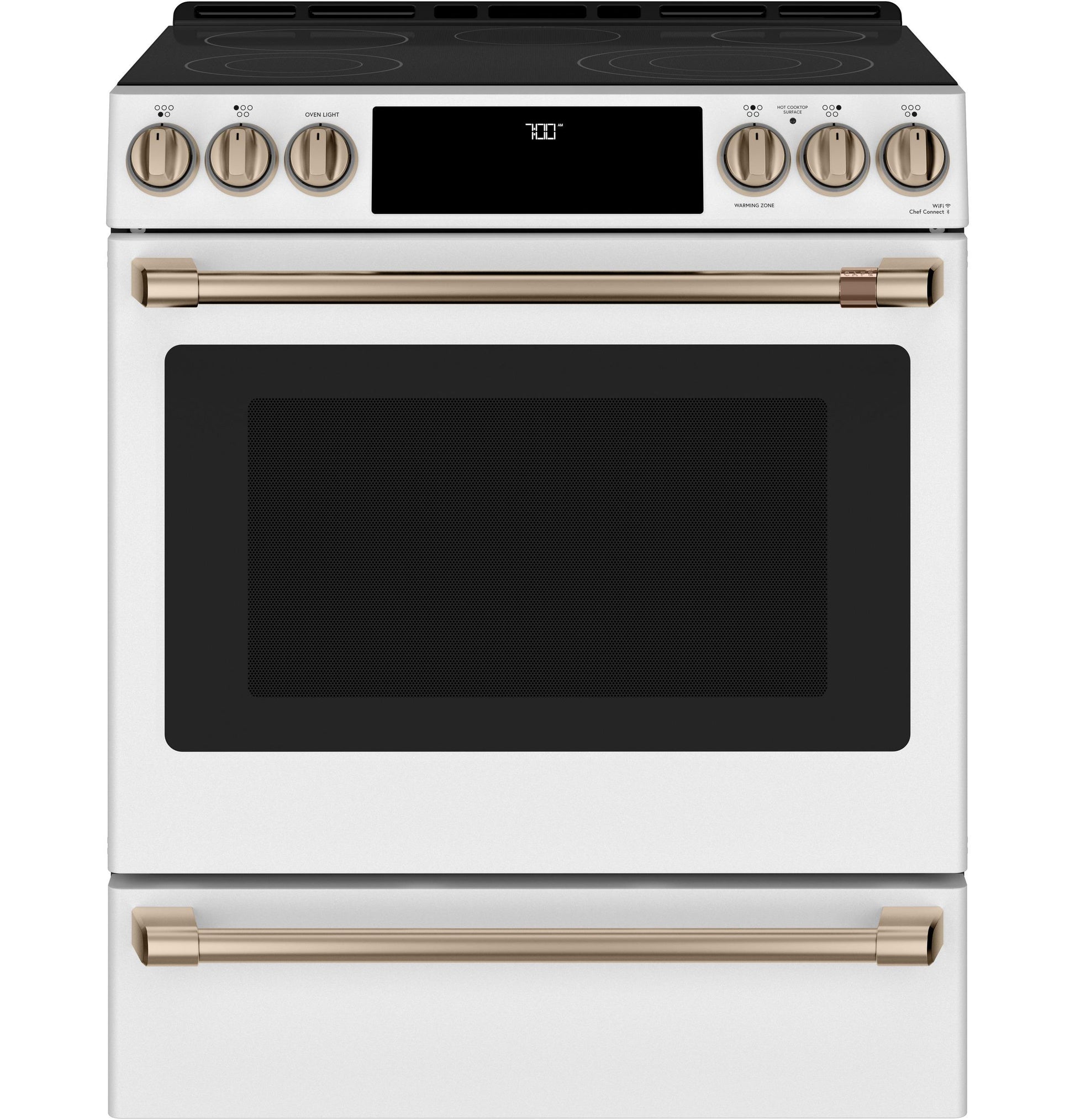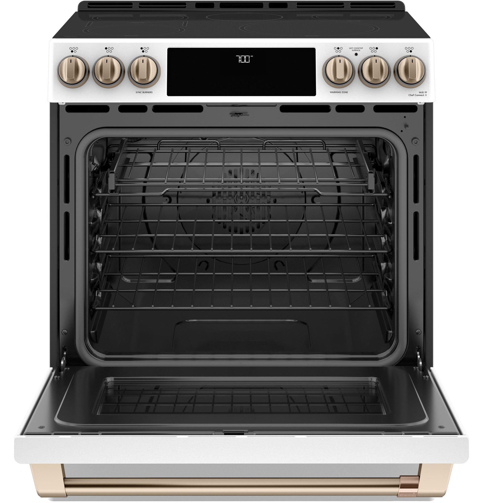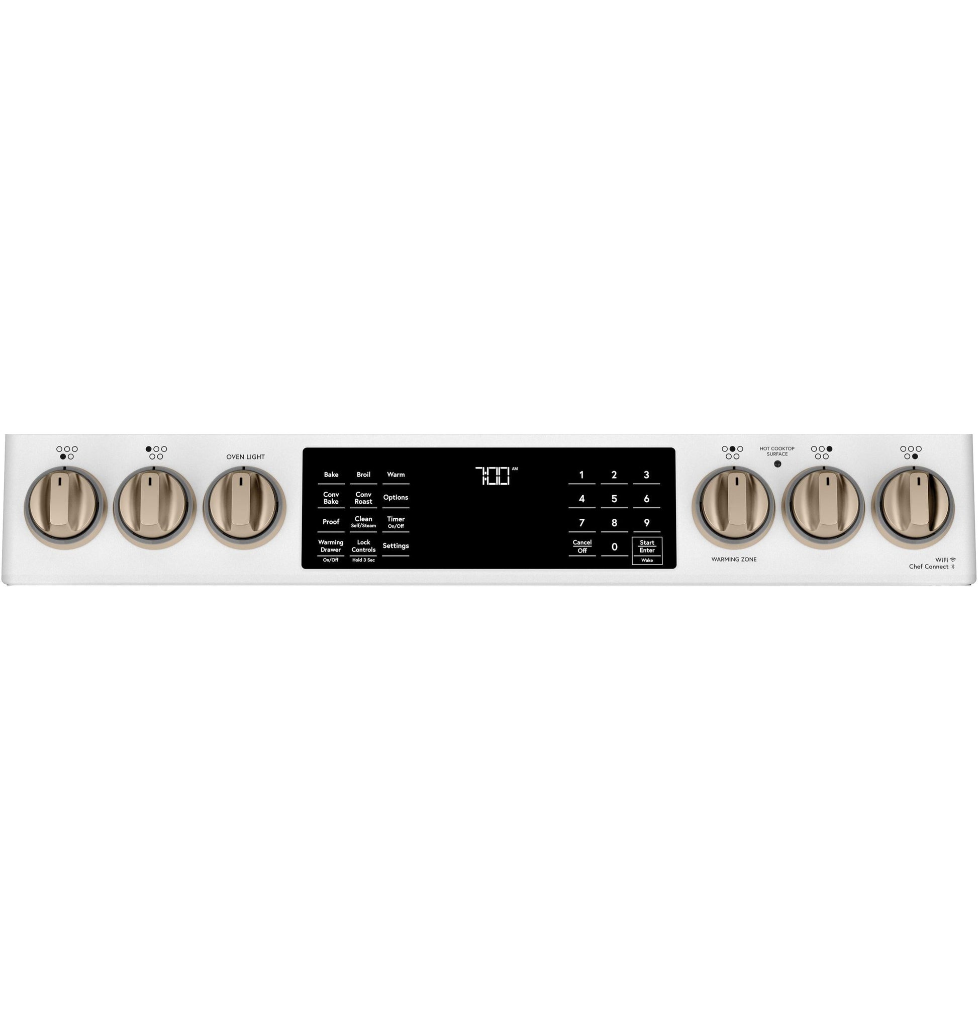 Finished in matte white with brushed bronze hardware, the Café CES700P4MW2 adds a touch of elegance to any kitchen, offering both advanced cooking performance and aesthetic appeal.