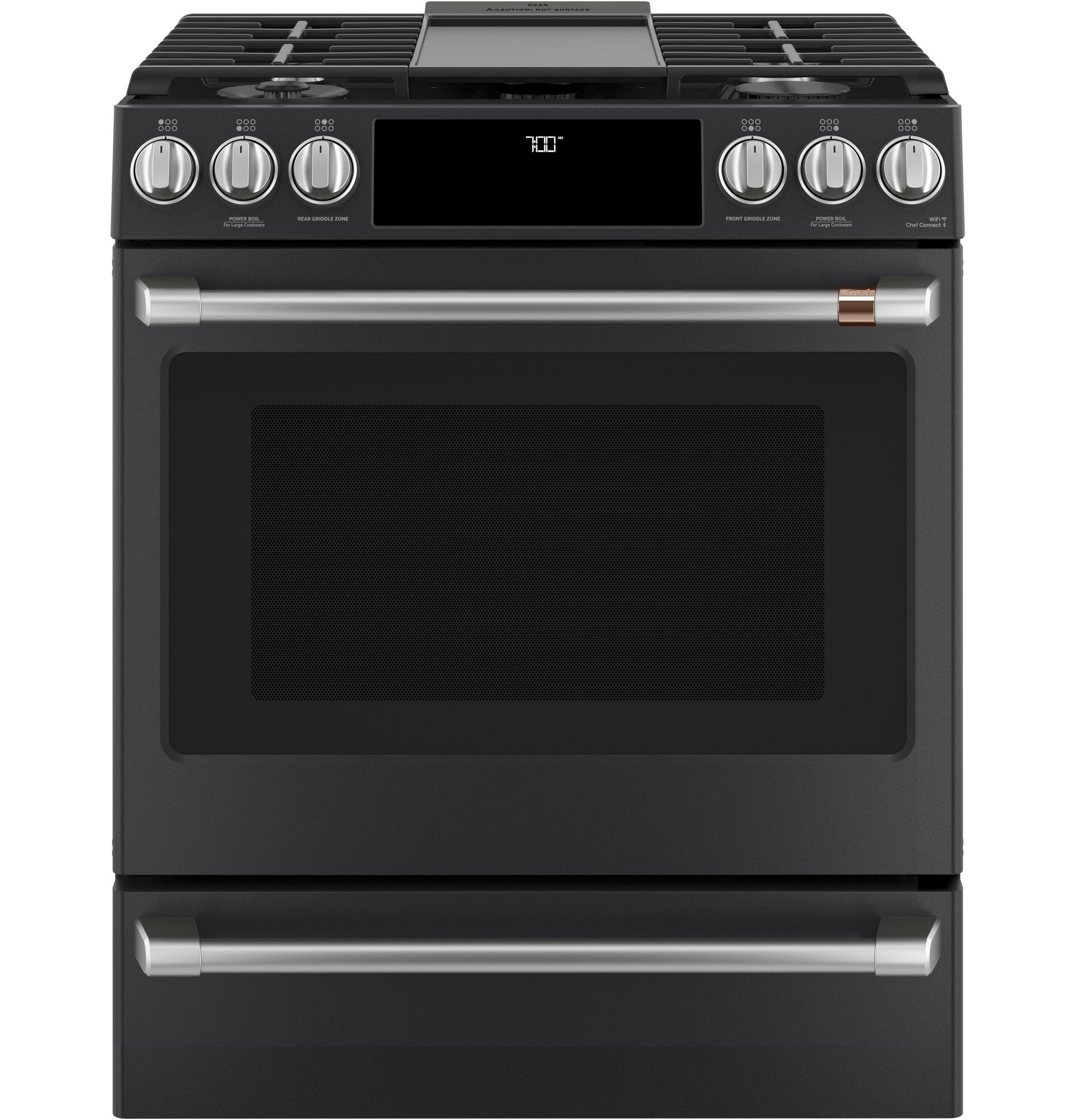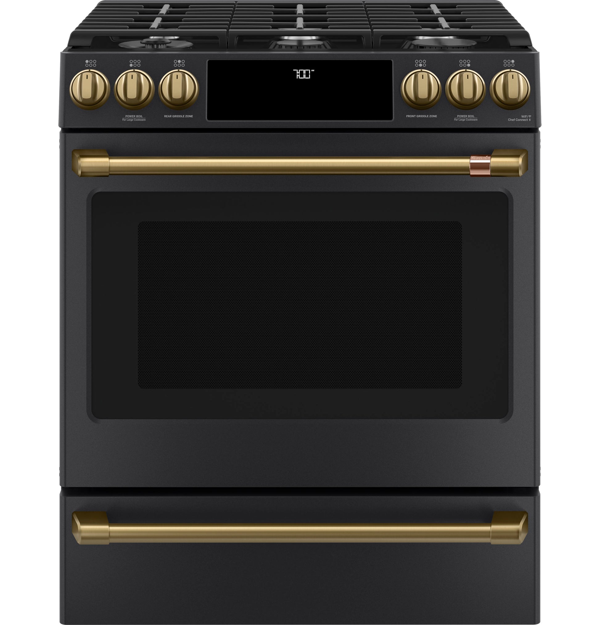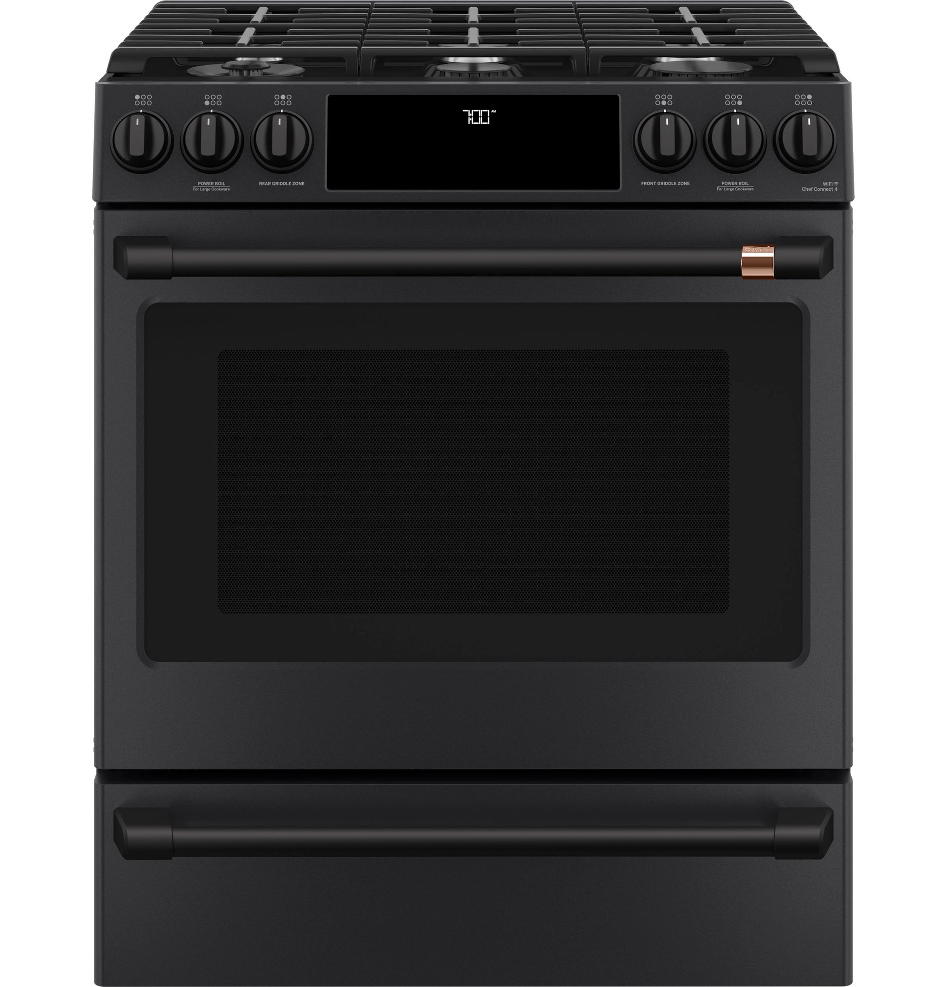 Elevate your cooking experience with the Café™ 30" Smart Slide-In, Front-Control, Gas Range with Convection Oven (Model: CGS700P3MD1). This range boasts a Matte Black finish, complemented by Brushed Stainless hardware, adding a touch of sophistication to any kitchen. The edge-to-edge six-burner cooktop provides ample space for cookware of all sizes, featuring a 21,000 BTU tri-ring burner for versatile cooking options, from rapid boiling to precise simmering. An integrated cast-iron griddle allows for easy preparation of favorites like pancakes and grilled sandwiches. The True European Convection system ensures even baking and roasting, delivering consistent results every time. With Built-In WiFi, you can manage all aspects of your kitchen through the SmartHQ™ App or your voice assistant, enabling remote control and monitoring. The innovative No-Preheat Air Fry feature lets you cook healthier, crispier versions of your favorite foods in less time, without the need for preheating. An integrated temperature probe ensures meats are cooked to perfection, eliminating guesswork. The sleek backlit glass touch control panel visually disappears when not in use and illuminates upon prompting, maintaining the appliance's modern aesthetic. Additionally, the self-cleaning oven racks can remain inside during the cleaning cycle, simplifying maintenance. This range is ADA Compliant, ensuring accessibility and ease of use for all.