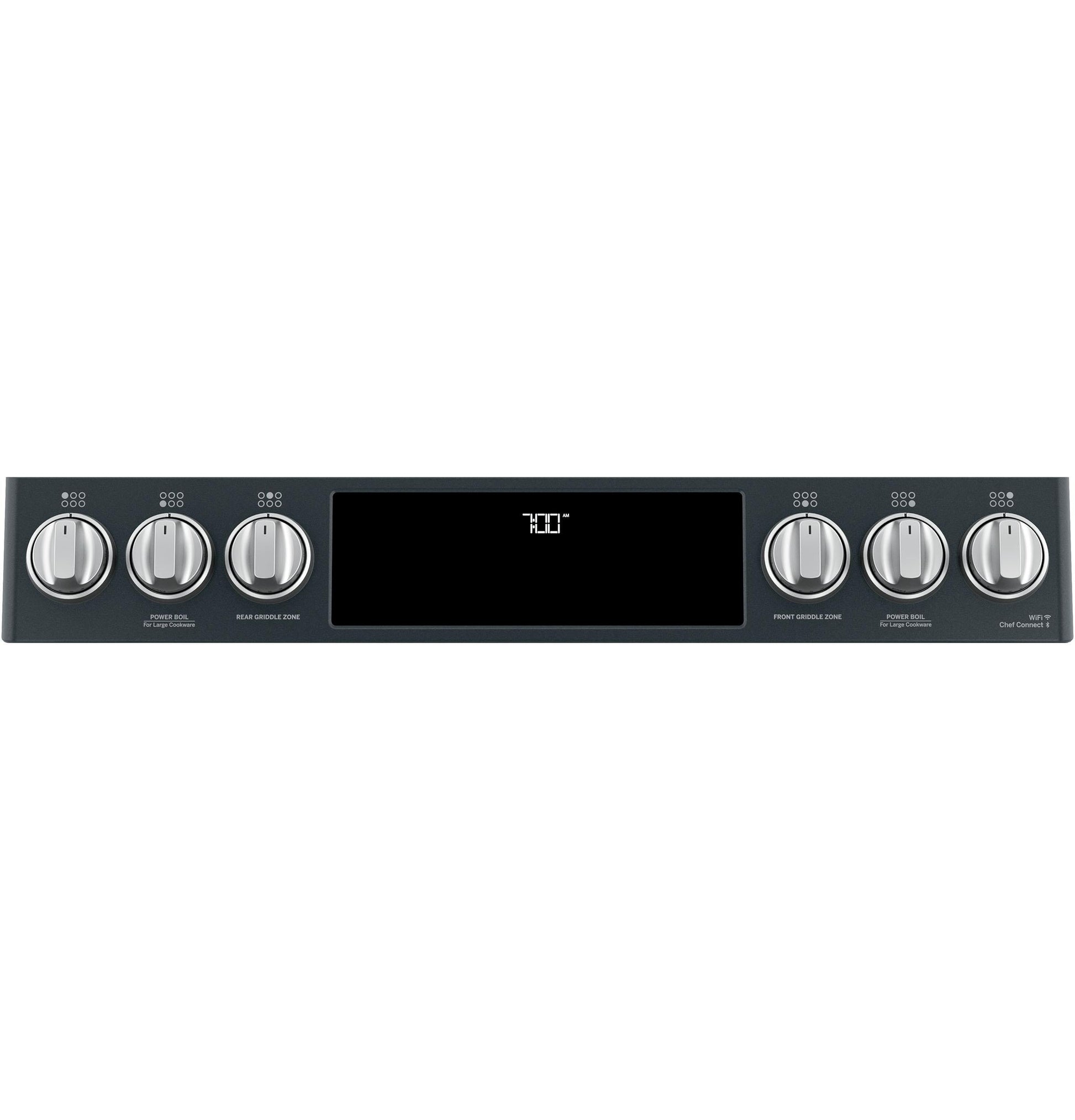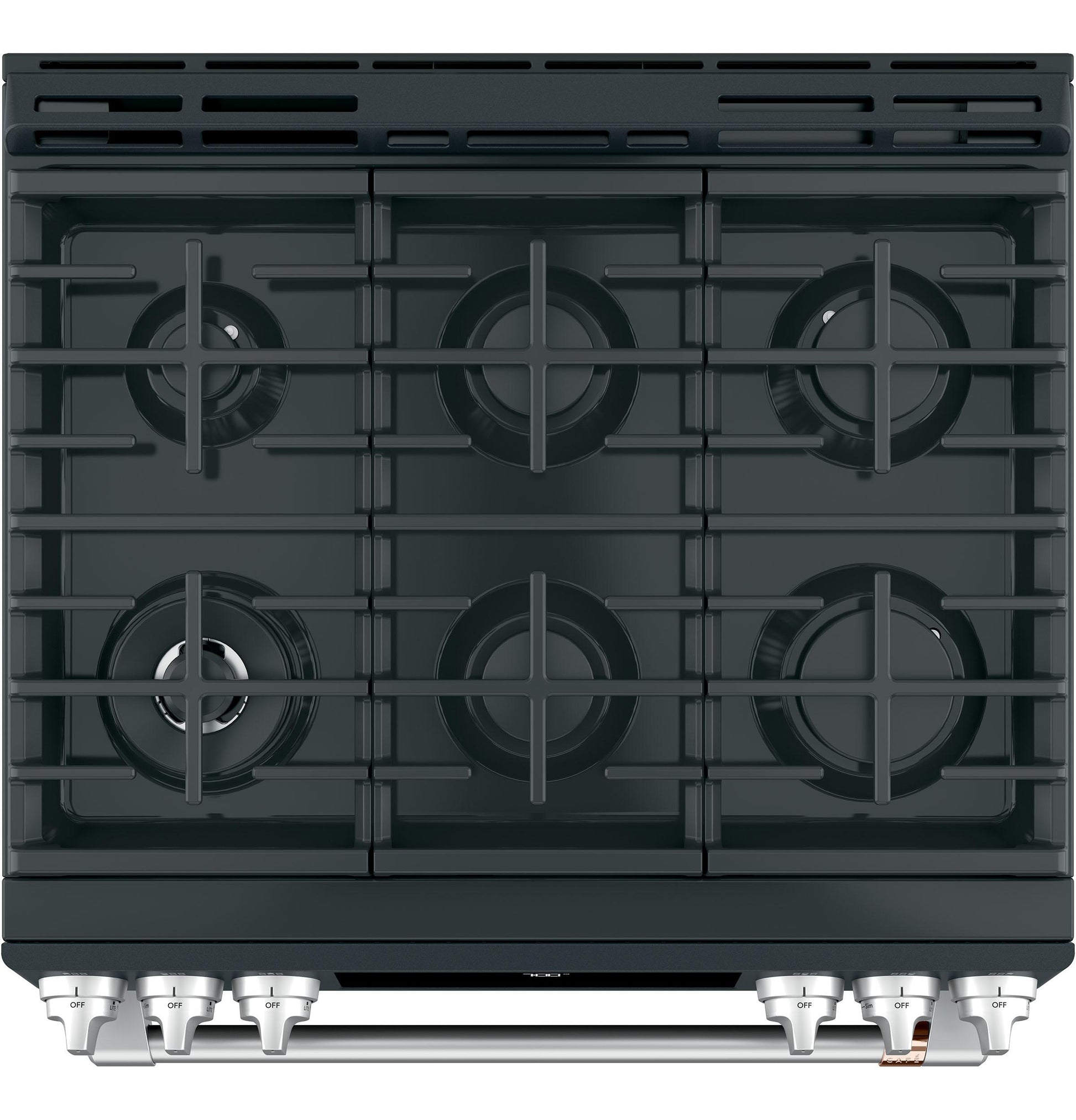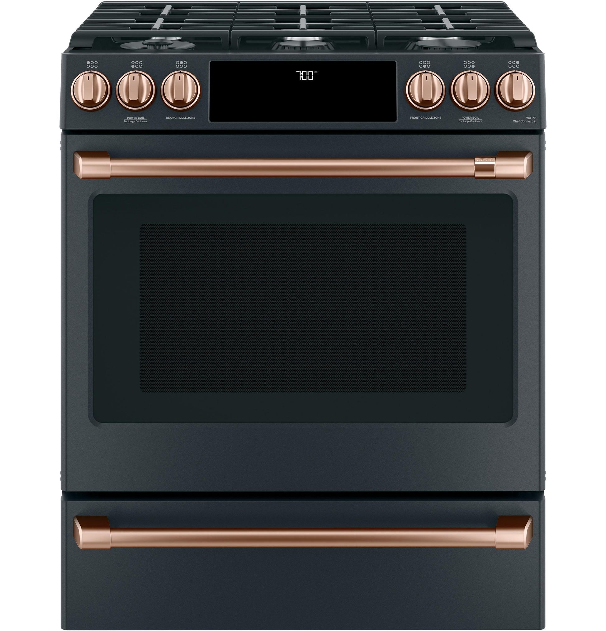 Elevate your cooking experience with the Café™ 30" Smart Slide-In, Front-Control, Gas Range with Convection Oven (Model: CGS700P3MD1). This range boasts a Matte Black finish, complemented by Brushed Stainless hardware, adding a touch of sophistication to any kitchen. The edge-to-edge six-burner cooktop provides ample space for cookware of all sizes, featuring a 21,000 BTU tri-ring burner for versatile cooking options, from rapid boiling to precise simmering. An integrated cast-iron griddle allows for easy preparation of favorites like pancakes and grilled sandwiches. The True European Convection system ensures even baking and roasting, delivering consistent results every time. With Built-In WiFi, you can manage all aspects of your kitchen through the SmartHQ™ App or your voice assistant, enabling remote control and monitoring. The innovative No-Preheat Air Fry feature lets you cook healthier, crispier versions of your favorite foods in less time, without the need for preheating. An integrated temperature probe ensures meats are cooked to perfection, eliminating guesswork. The sleek backlit glass touch control panel visually disappears when not in use and illuminates upon prompting, maintaining the appliance's modern aesthetic. Additionally, the self-cleaning oven racks can remain inside during the cleaning cycle, simplifying maintenance. This range is ADA Compliant, ensuring accessibility and ease of use for all.