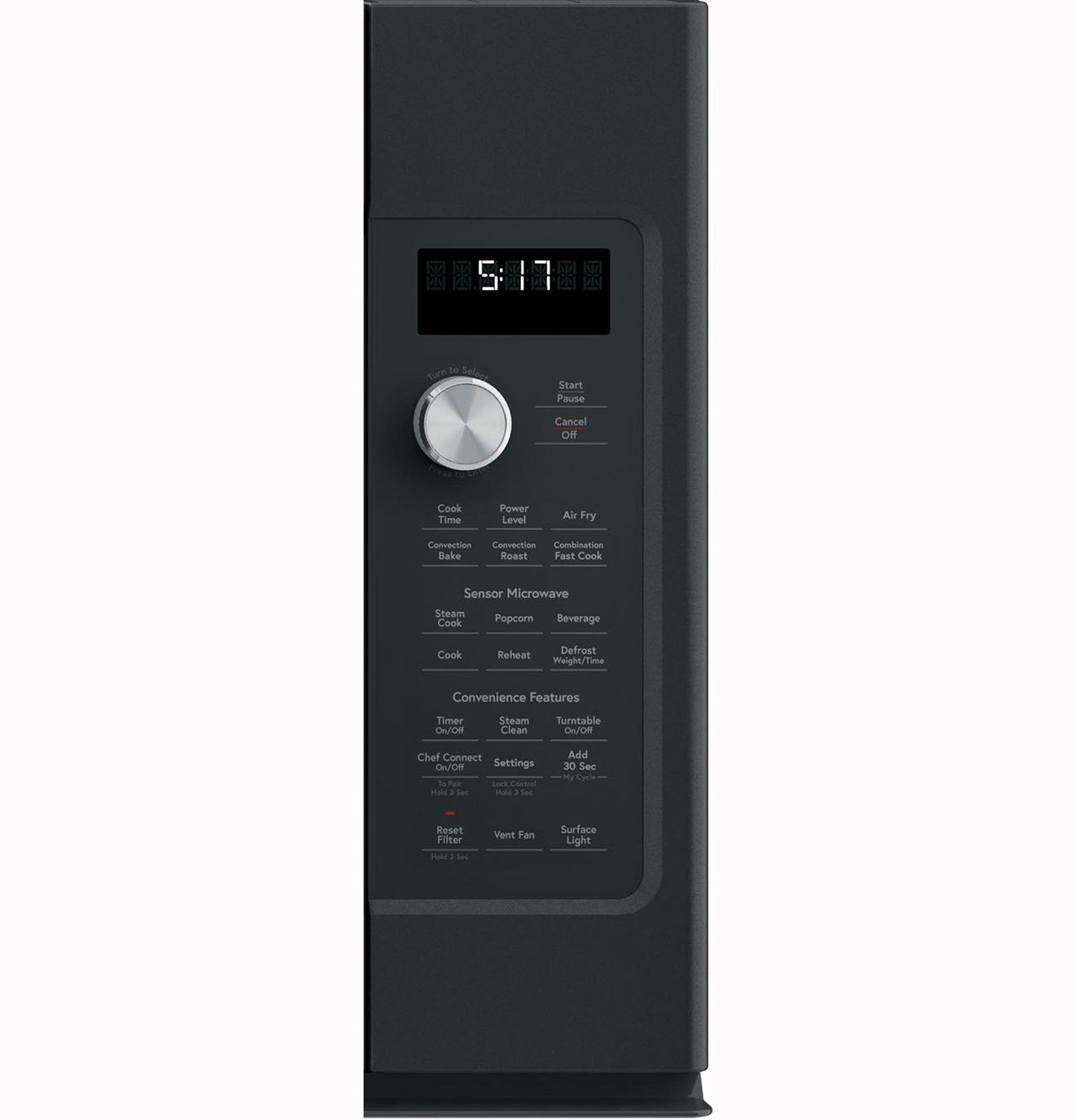 Elevate your kitchen with the Café1.7 Cu. Ft. Convection Over-the-Range Microwave Oven (model CVM517P3RD1). This appliance combines style and functionality, featuring a Matte Black finish that complements modern kitchen aesthetics. The microwave offers a spacious 1.7 cu. ft. capacity and operates at 950 watts, providing ample space and power for various cooking needs. With Air Fry technology, you can enjoy crispy, fried-like results without the excess oil. The Convection Bake and Convection Roast modes ensure even heat distribution for perfectly baked or roasted dishes. Sensor Cooking adjusts time and power automatically for optimal results, while Chef Connect allows synchronization with other compatible Café appliances for a streamlined cooking experience. Additional features include a 300 CFM venting system to effectively remove smoke and odors, LED cooktop lighting for clear visibility, and a stainless steel interior for easy cleaning.