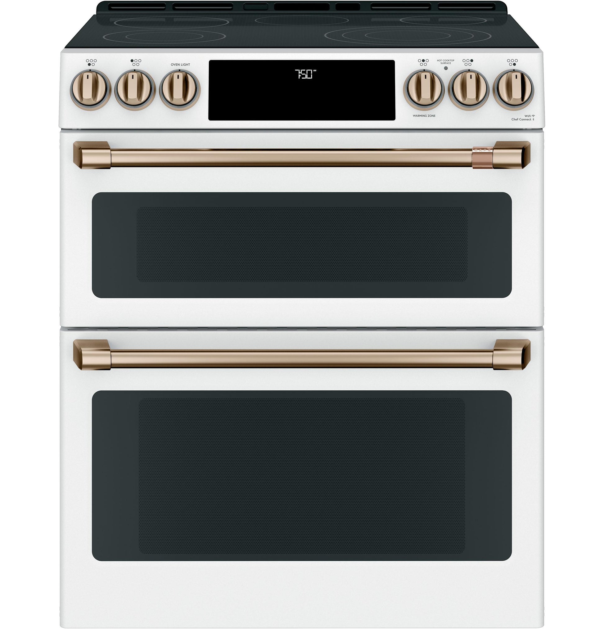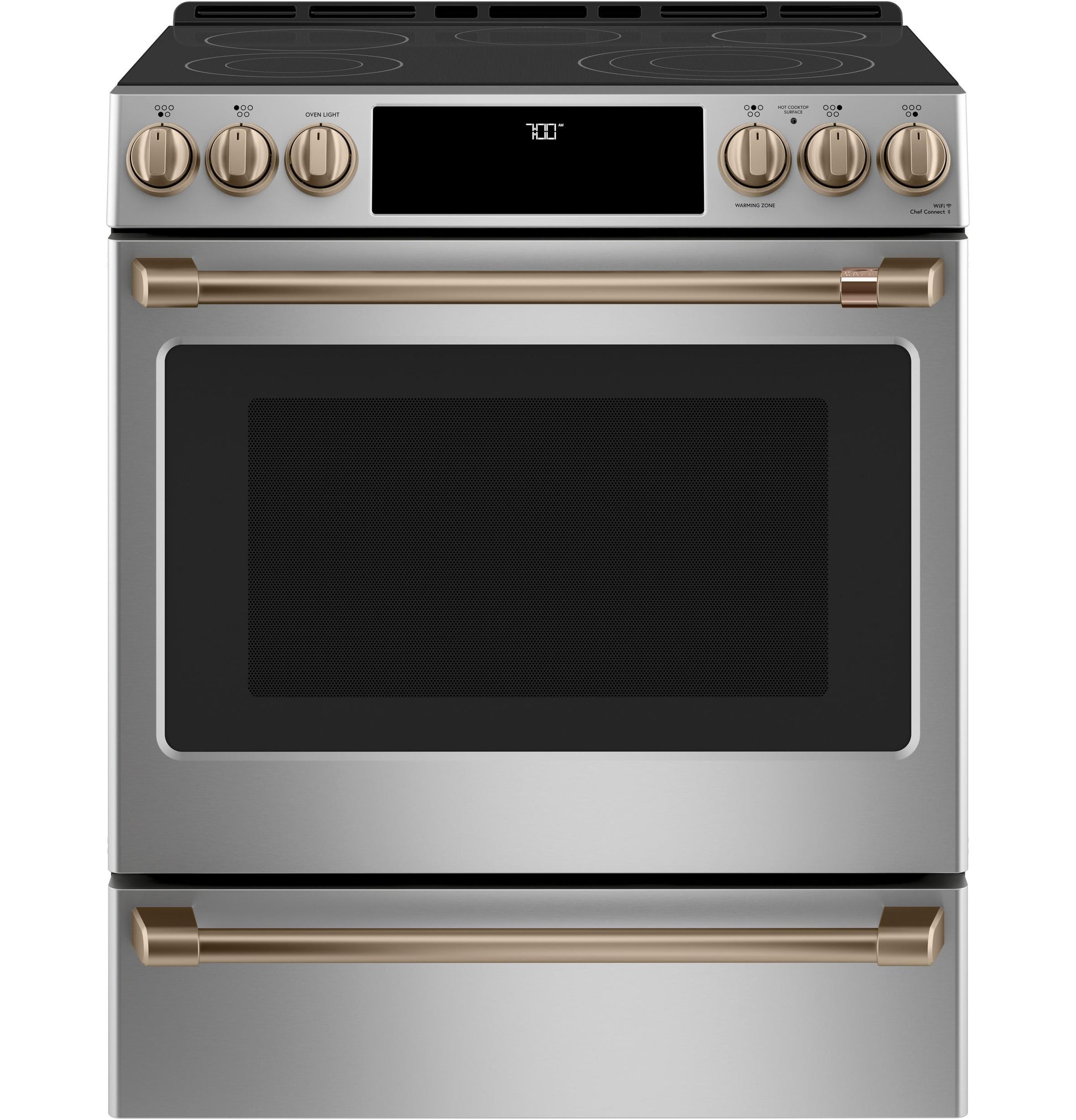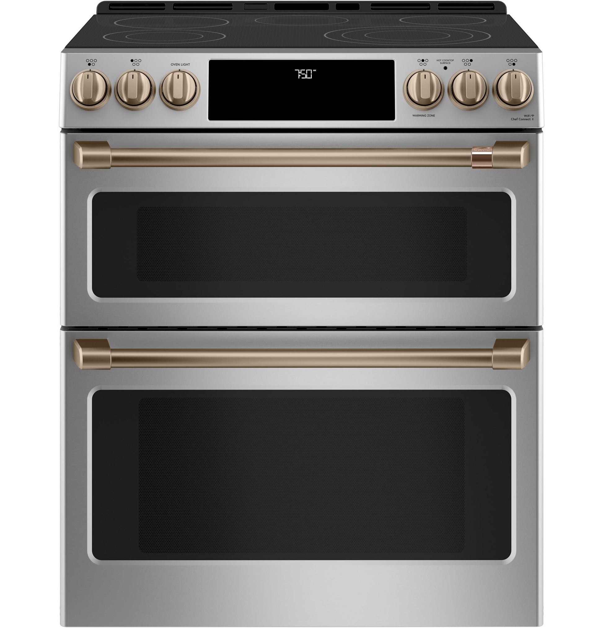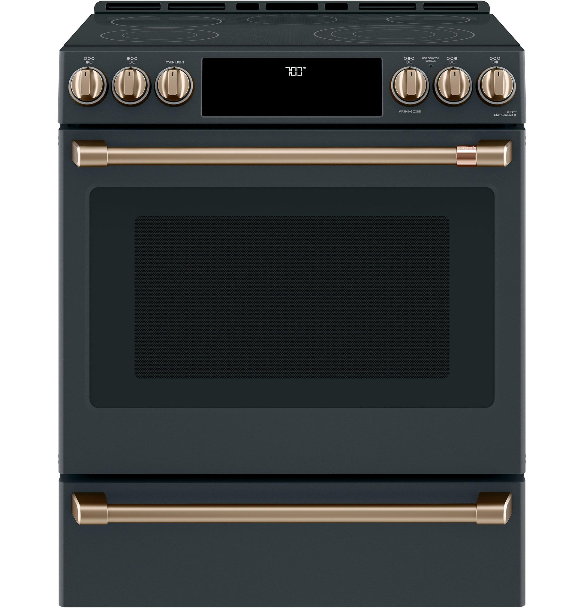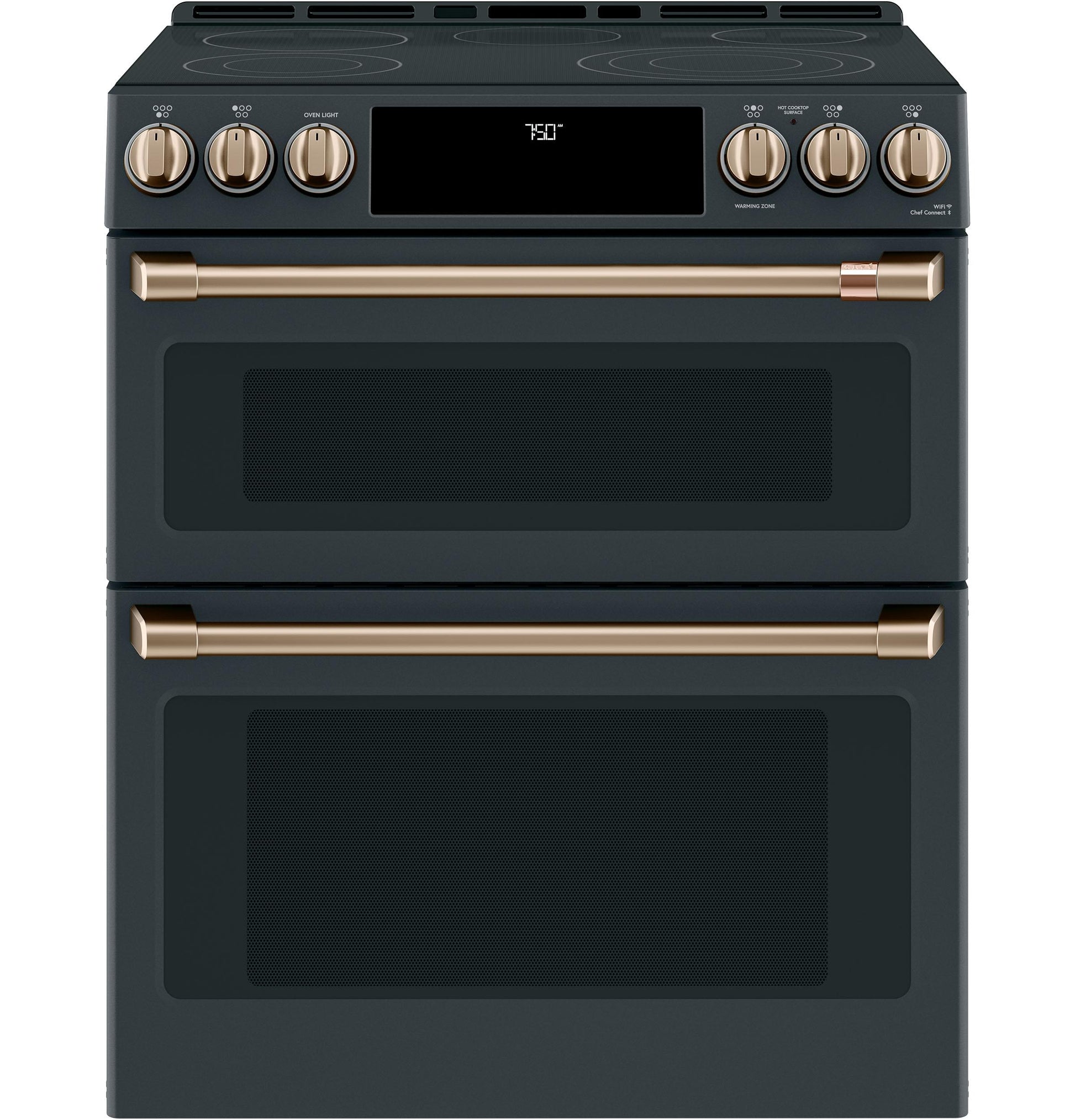 Brushed bronze finish adds a warm, elegant accent to your CAFE electric cooktop.