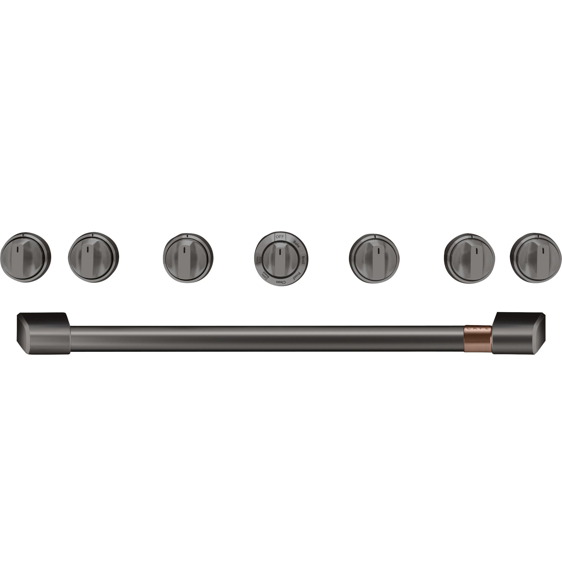 Premium 36" brushed black handle & knob set designed to elevate CAFÉ Pro Ranges and Rangetops.