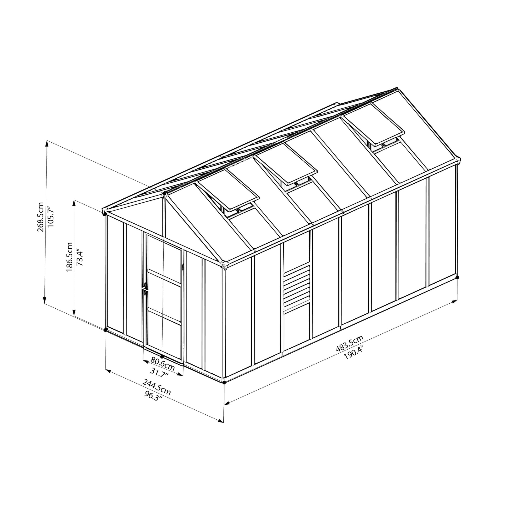 The Glory premium class greenhouse is the right answer for the year around gardening enthusiasts. The strong and robust gray powder-coated aluminum frame and 10mm thick polycarbonate panels make this a professional grade greenhouse that can be heated and/or cooled for year-round usage. The side louver window and roof vent allow proper airflow for the ideal temperature to keep plants healthy. The heavy-duty door is over 31 inches wide and can be locked. The door threshold allows easy access for wheelchairs or wheelbarrows. The gutter system will allow you to collect fresh rainwater for your plants. With sidewalls over 6' tall and a peak of almost 9' you can trellis your tall and leafy plants or over-winter your small trees. If you are serious about growing, this is your greenhouse.