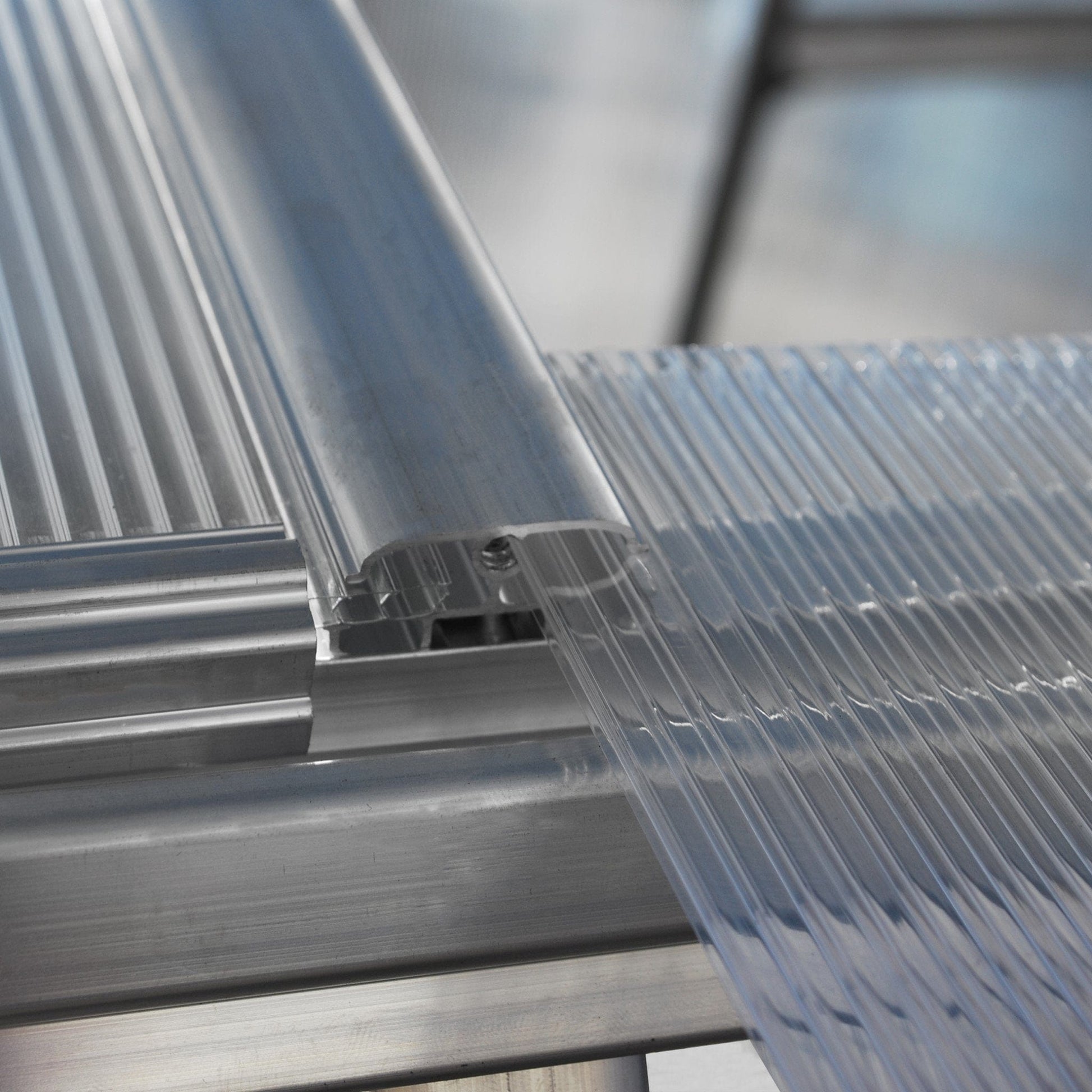 A: 4 mm twin-wall polycarbonate roof panels and 6 mm twin-wall polycarbonate side panels for high UV protection and excellent light transmission.