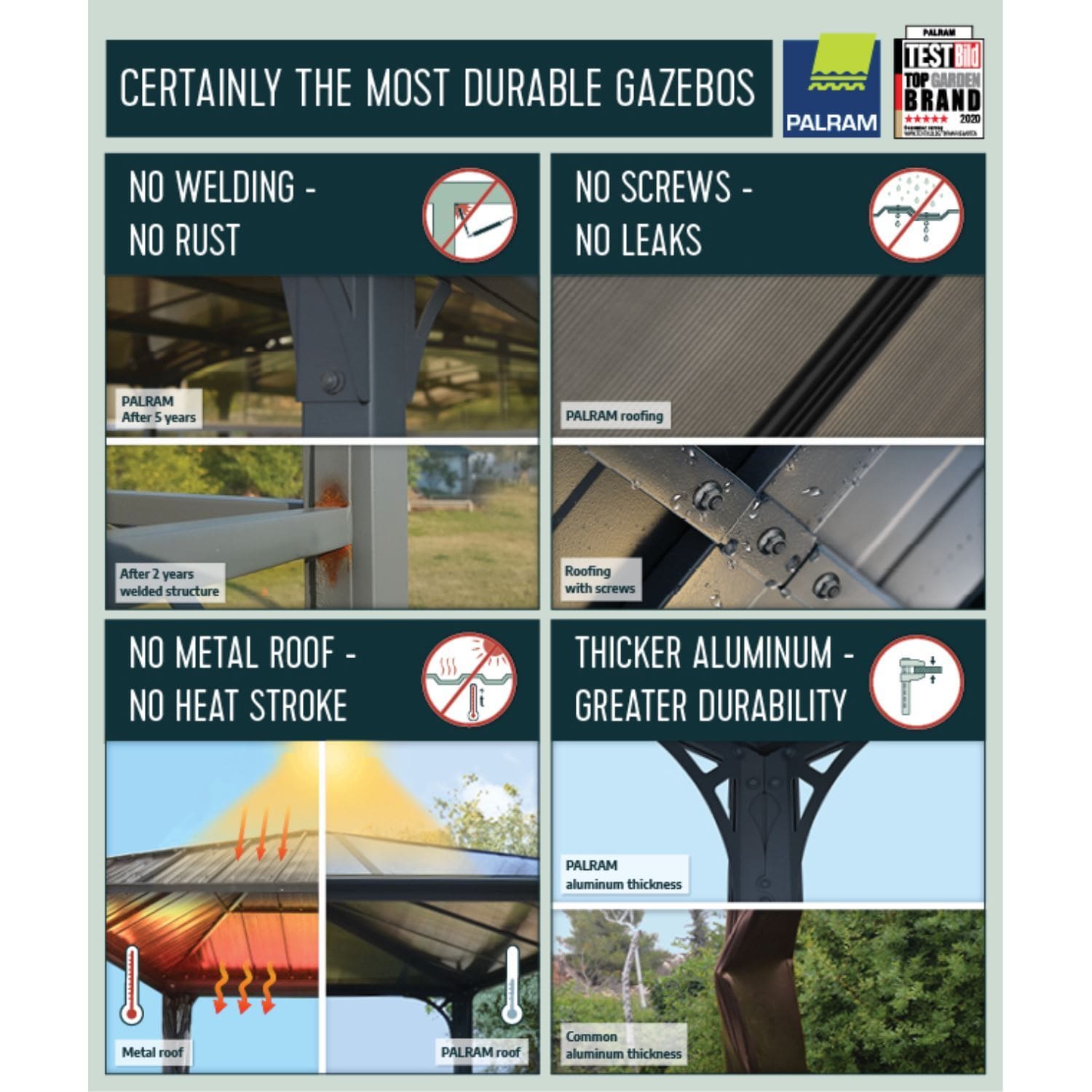 The Martinique 12' x 16' Rectangular Garden Gazebo gives you that outdoor gathering space that you’ve always wanted. Gutters and downspouts channel water towards the four corners and away from the sides to keep you dry. Decorative but functional, the roof ornament keeps rain out and vents smoke and humidity. The stylish and durable design features a durable corrosion-resistant powder-coated aluminum frame in anthracite gray and 6mm twin-wall polycarbonate roof panels with bronze glazing to block harmful UV rays while allowing diffuse light to filter through. The Martinique gazebo sets up quickly and easily and can be attached to any surface with the included anchors.