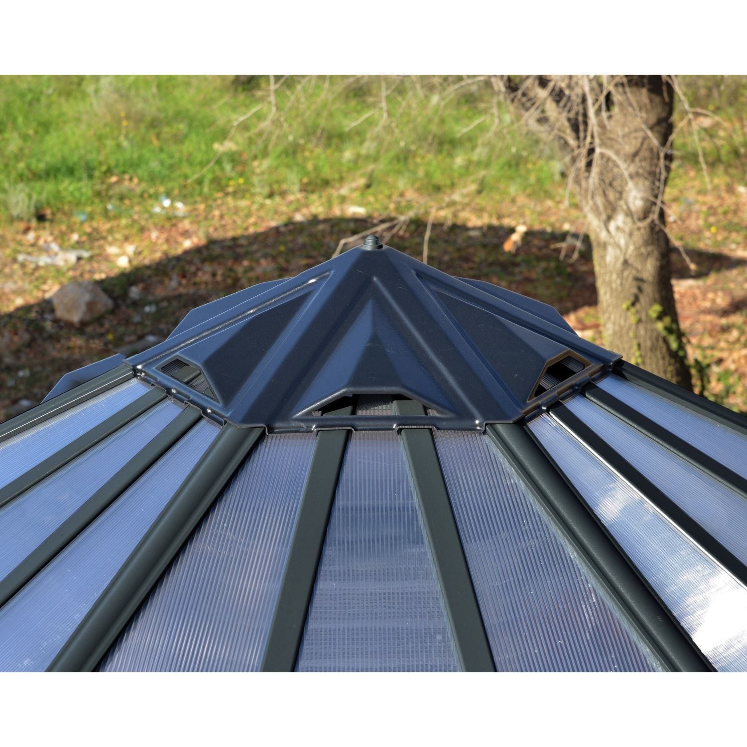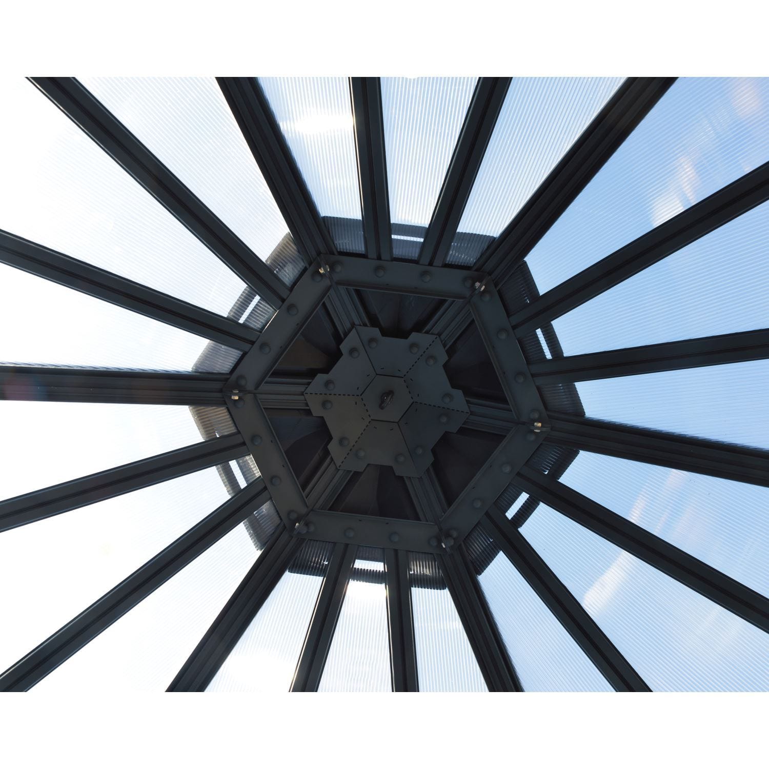 A: A 12x10 ft outdoor hex‑shaped greenhouse with a gray frame and 0.8 mm polycarbonate panels for plant protection and light diffusion.