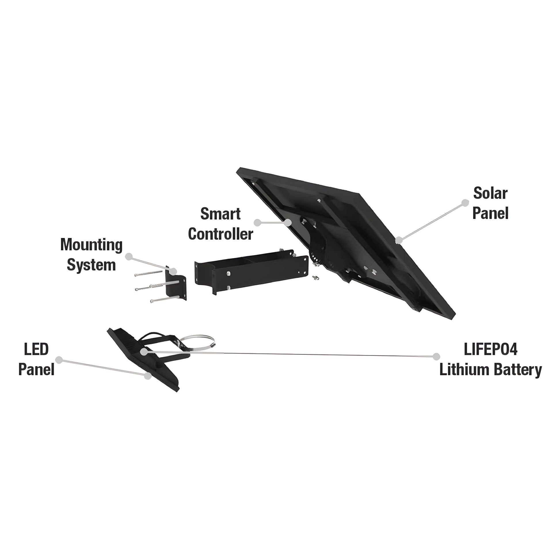 15-Watt Solar-Powered LED – Provides 2,100 lumens of bright, 5000K daylight illumination.