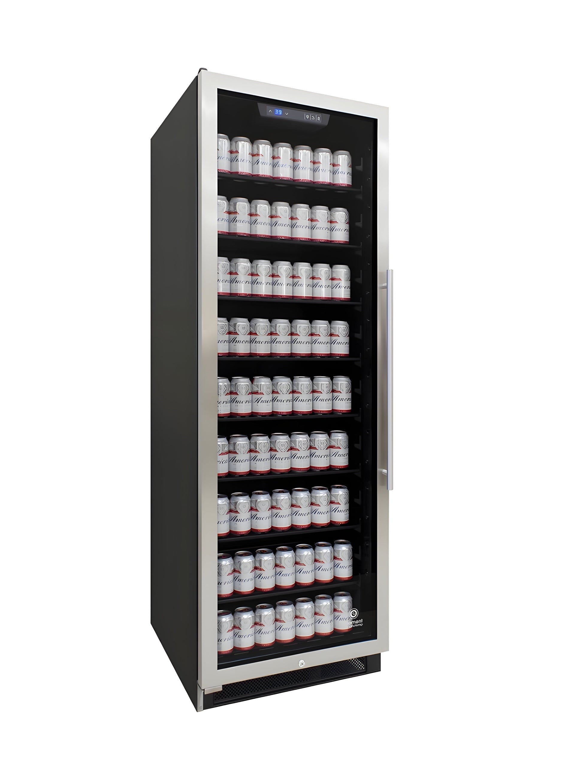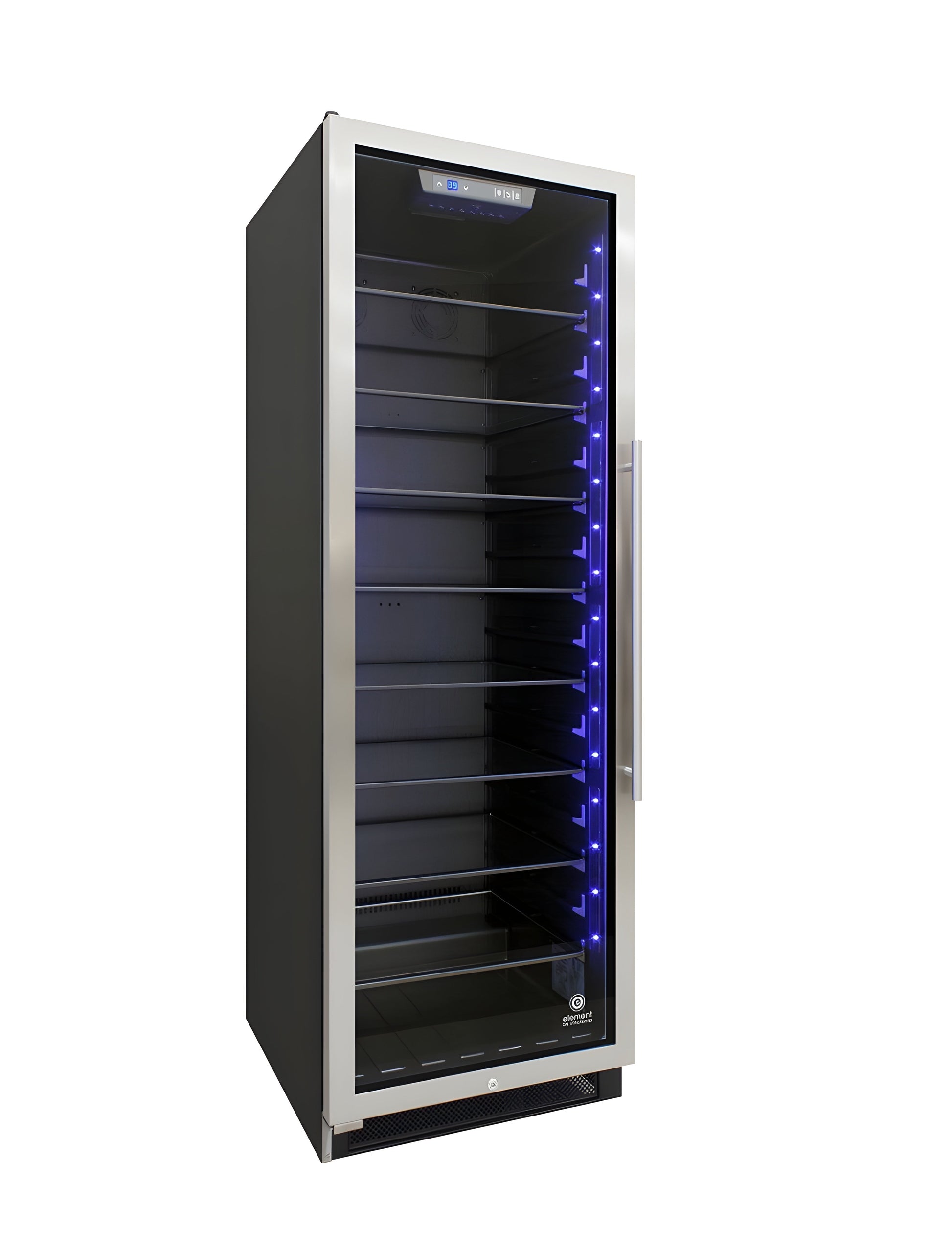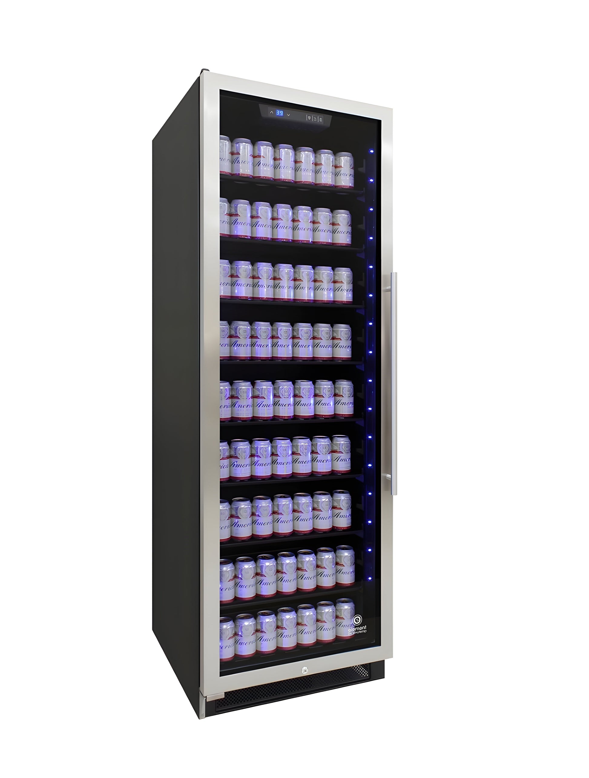 The Connoisseur Series 168 Single-Zone Beverage Cooler is an essential for those who love to entertain. Equipped with front exhaust, this beverage cooler is designed to fit seamlessly in existing cabinetry. The easy to use digital control panel makes adjusting the temperature simple while providing peace of mind that your beverages are always ready to be enjoyed. The blue LED lighting illuminates the cooler’s contents behind a seamless stainless steel door, making this beverage cooler an aesthetically pleasing addition to any room. Sliding tempered glass shelves holds approximately 430 12 oz. cans. Beautiful and functional, this beverage cooler is sure to be the centerpiece of get-together for years to come.