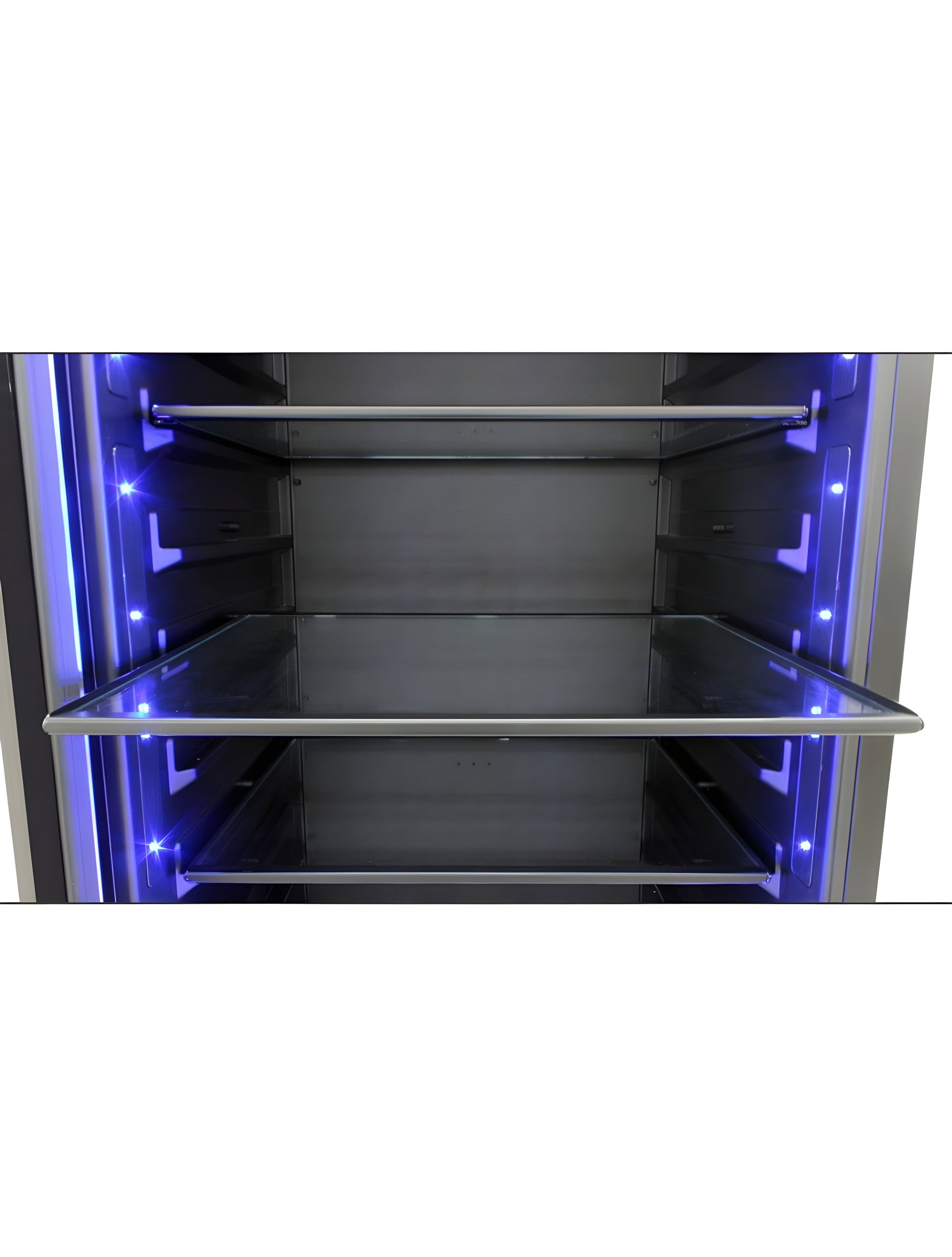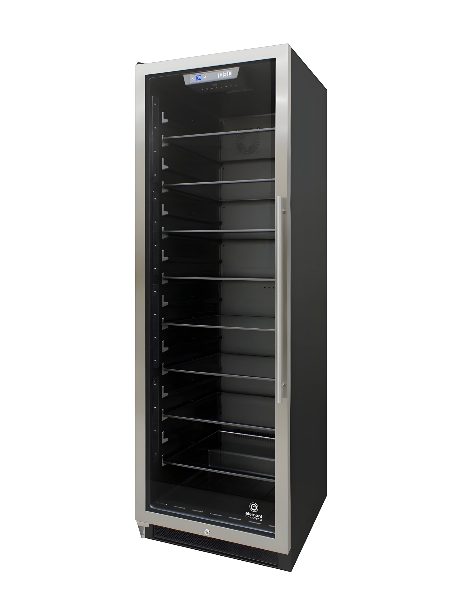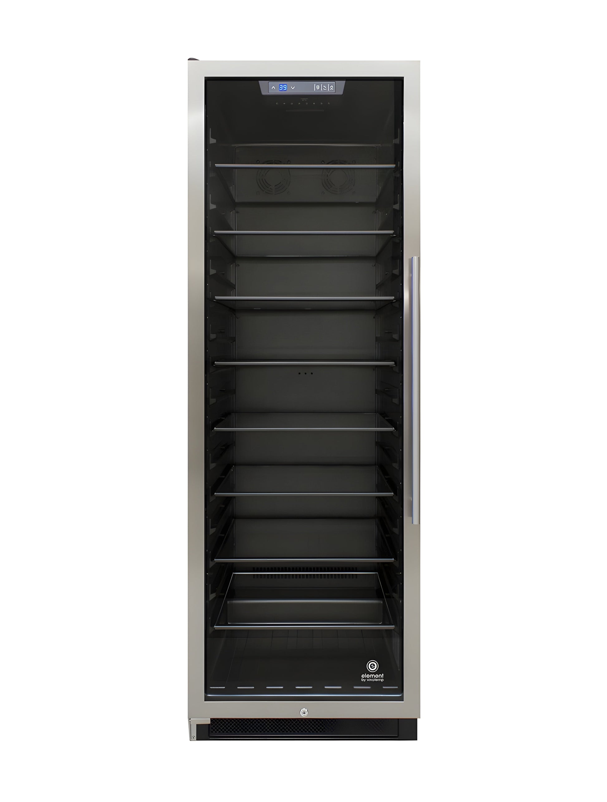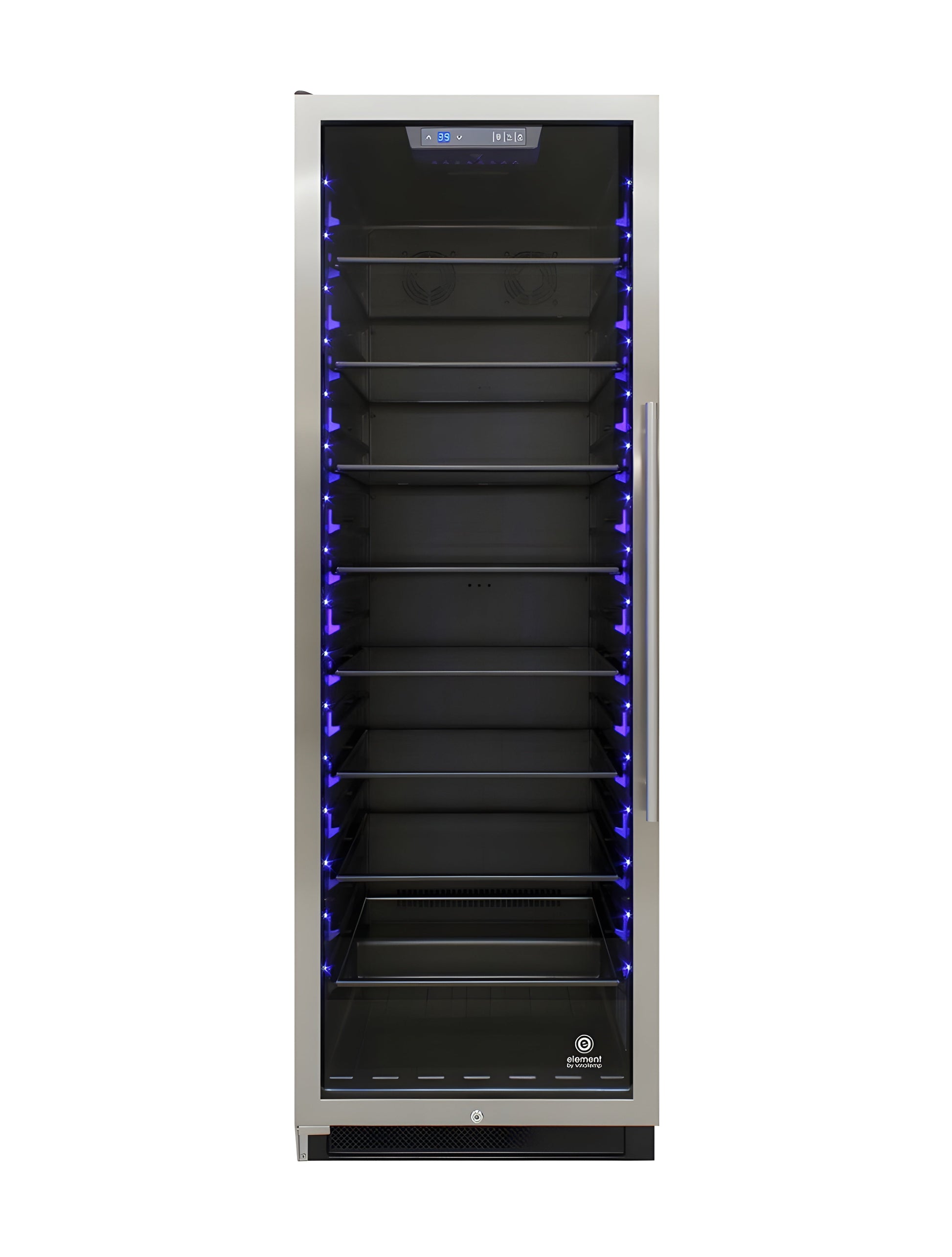 The Connoisseur Series 168 Single-Zone Beverage Cooler is an essential for those who love to entertain. Equipped with front exhaust, this beverage cooler is designed to fit seamlessly in existing cabinetry. The easy to use digital control panel makes adjusting the temperature simple while providing peace of mind that your beverages are always ready to be enjoyed. The blue LED lighting illuminates the cooler’s contents behind a seamless stainless steel door, making this beverage cooler an aesthetically pleasing addition to any room. Sliding tempered glass shelves holds approximately 430 12 oz. cans. Beautiful and functional, this beverage cooler is sure to be the centerpiece of get-together for years to come.