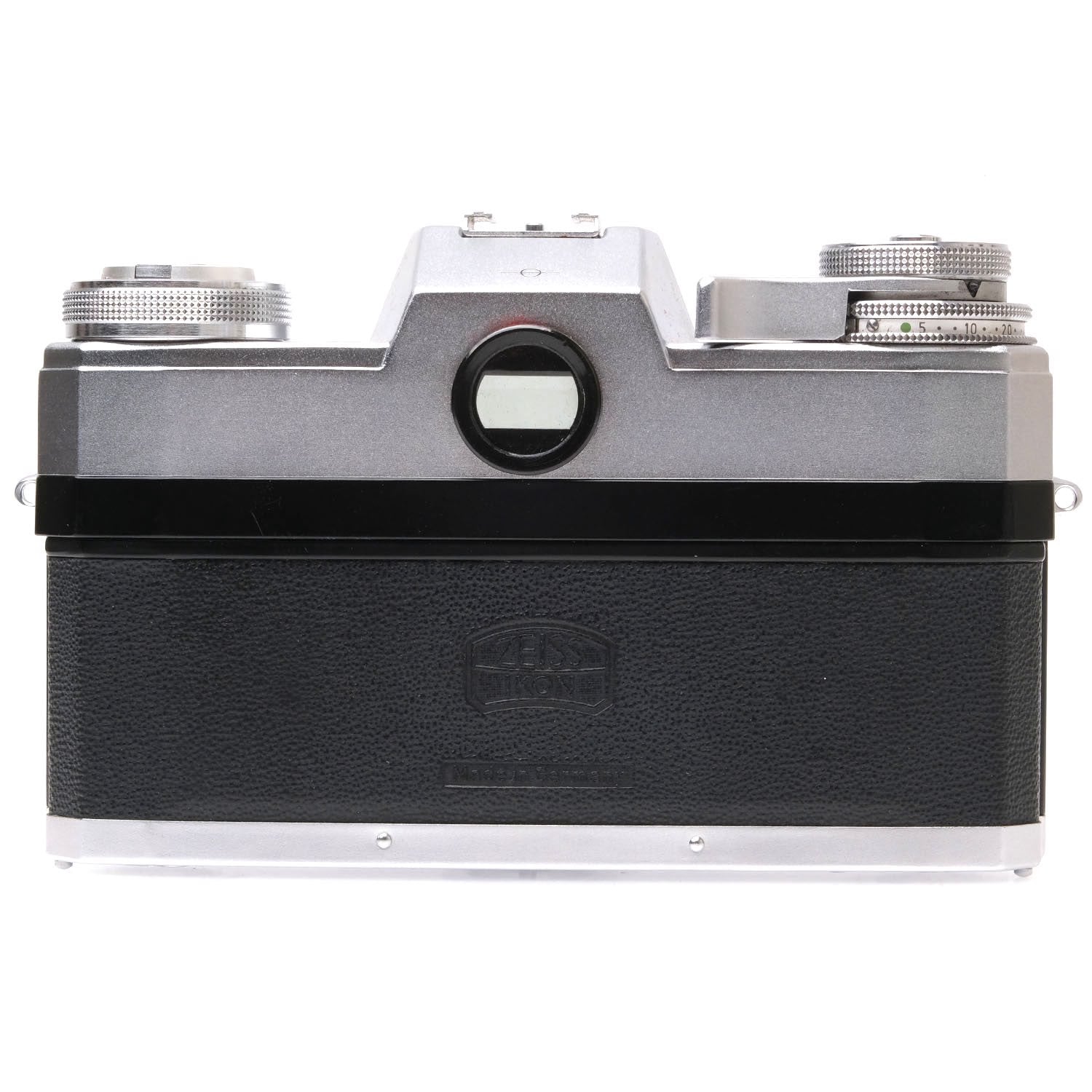This Contarex Bullseye, #Y7897, is in great condition with minor handling wear. I rate it cosmetically a (9+). The camera is mostly functional; film advances properly, the viewfinder is clear, and the shutter fires, but it's inaccurate at speeds below 2. Sometimes the shutter button itself also sticks. The aperture wheel is smooth. The meter does not function. The included Zeiss 50mm f2 Planar lens, #2370059, is in similar condition, also rated a (9+). The focus ring is smooth, the aperture functions properly, and the glass is clean and clear with no haze, marks, or fungus. There are a few faint specks of dust inside, but they do not affect image quality. This listing also includes a skylight filter, front lens cap, and a two-piece leather case. Please refer to the photos for details.