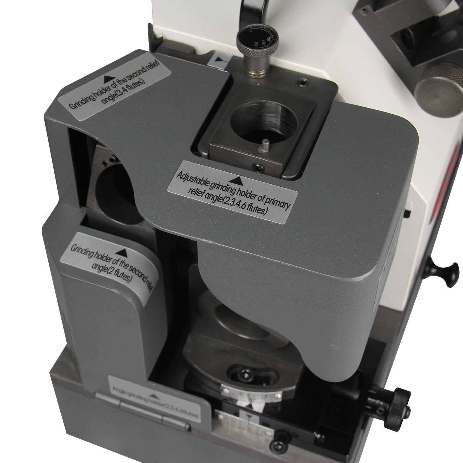 The portable end mill grinder can grind 2-flute, 3-flute, 4-flute, and 6-flute end mills (the size should be more significant than Ф12 mm). An optional fixture group can grind 5-flute.