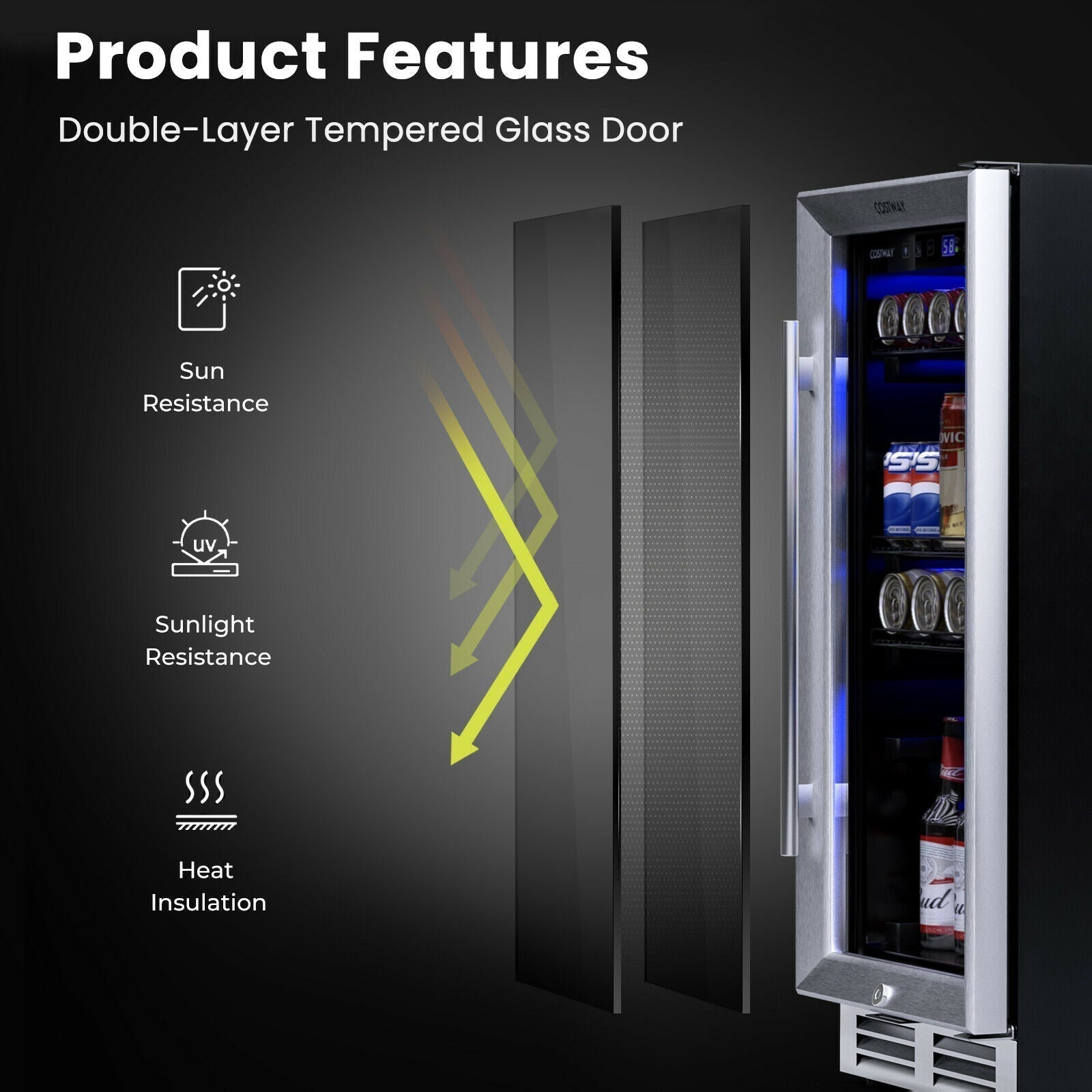 - Stylish Appearance and Double Glass Door: The double tempered glass door keeps the cool air inside, and prevents the heat and sunlight from penetrating inside. It also allows you view the drinks at a glance. The sleek black cabinet with stainless steel handle showcases tastes while built-in blue LED lights give a rich bar feel.