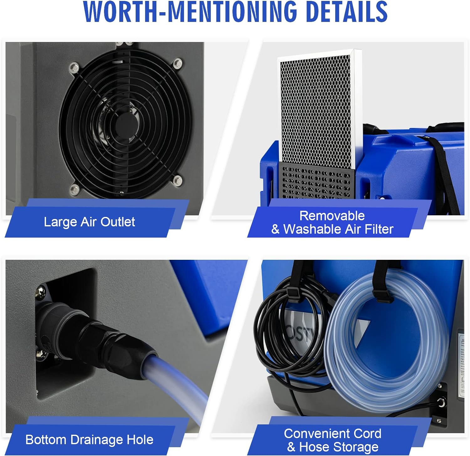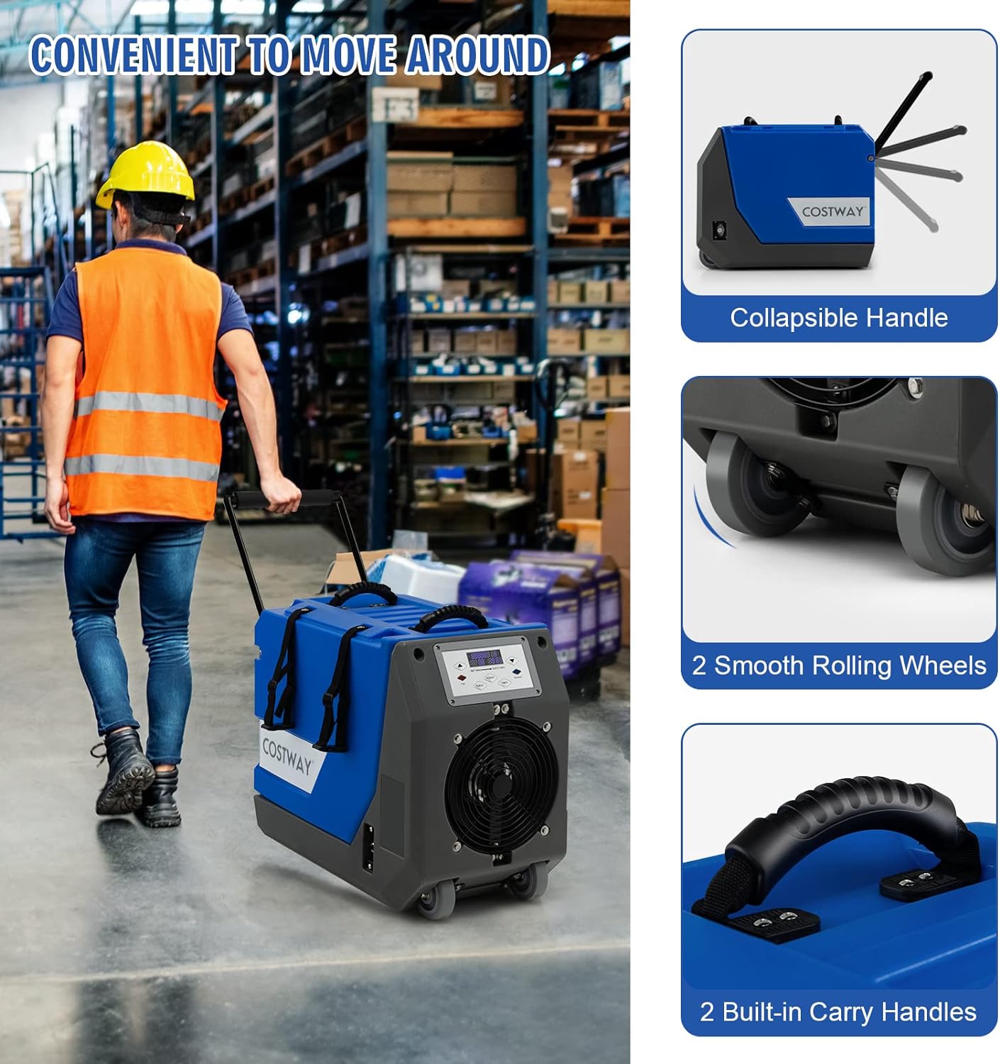 - Rugged Construction and Wide Application: Featuring a durable and impact-resistant roto-molded housing, this commercial-grade dehumidifier can stand the test of time. It is designed for big tasks like water damage restoration or reducing humidity in large spaces, such as construction building sites, warehouses, basements, wine cellars, etc.