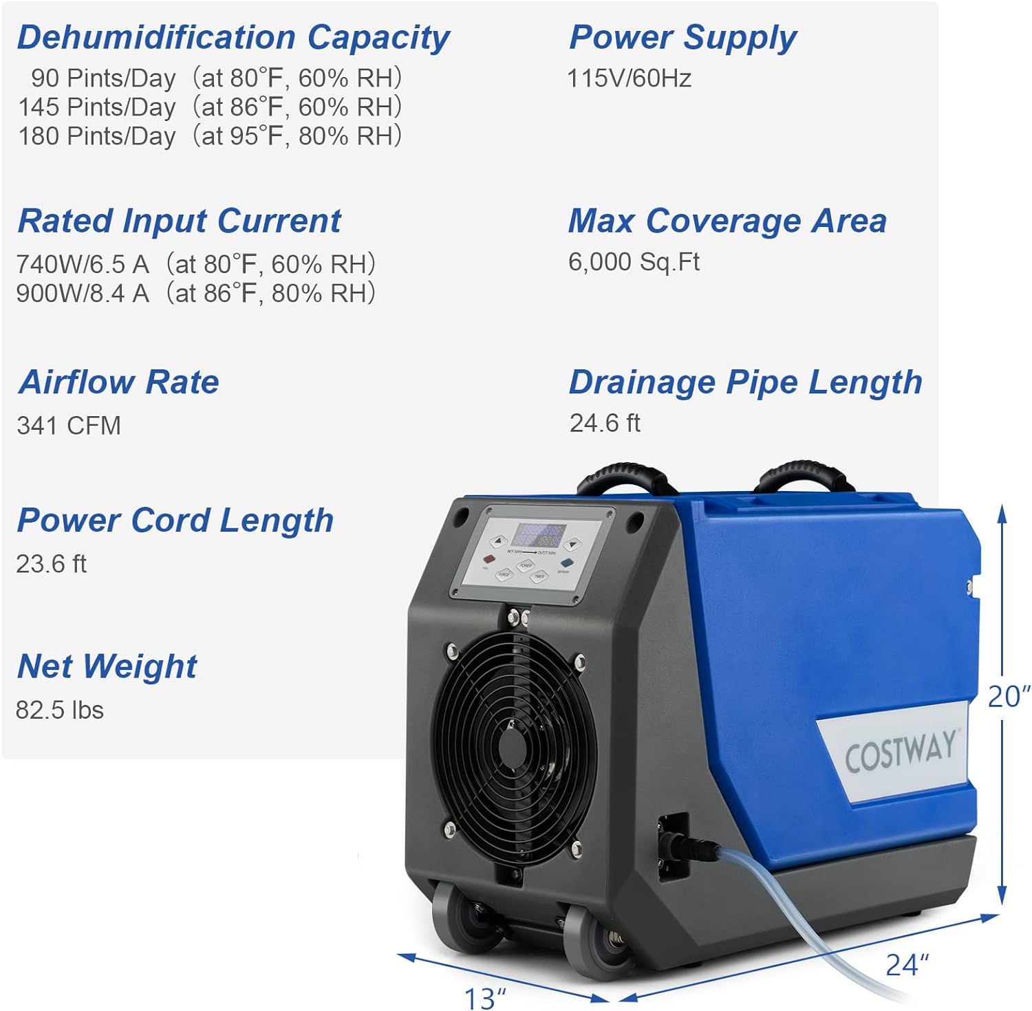 Costway Dehumidifier Commercial 180 Pints 341 CFM Basement/Crawl Space Pump And Drain Hose Blue New - ES10196US-BL