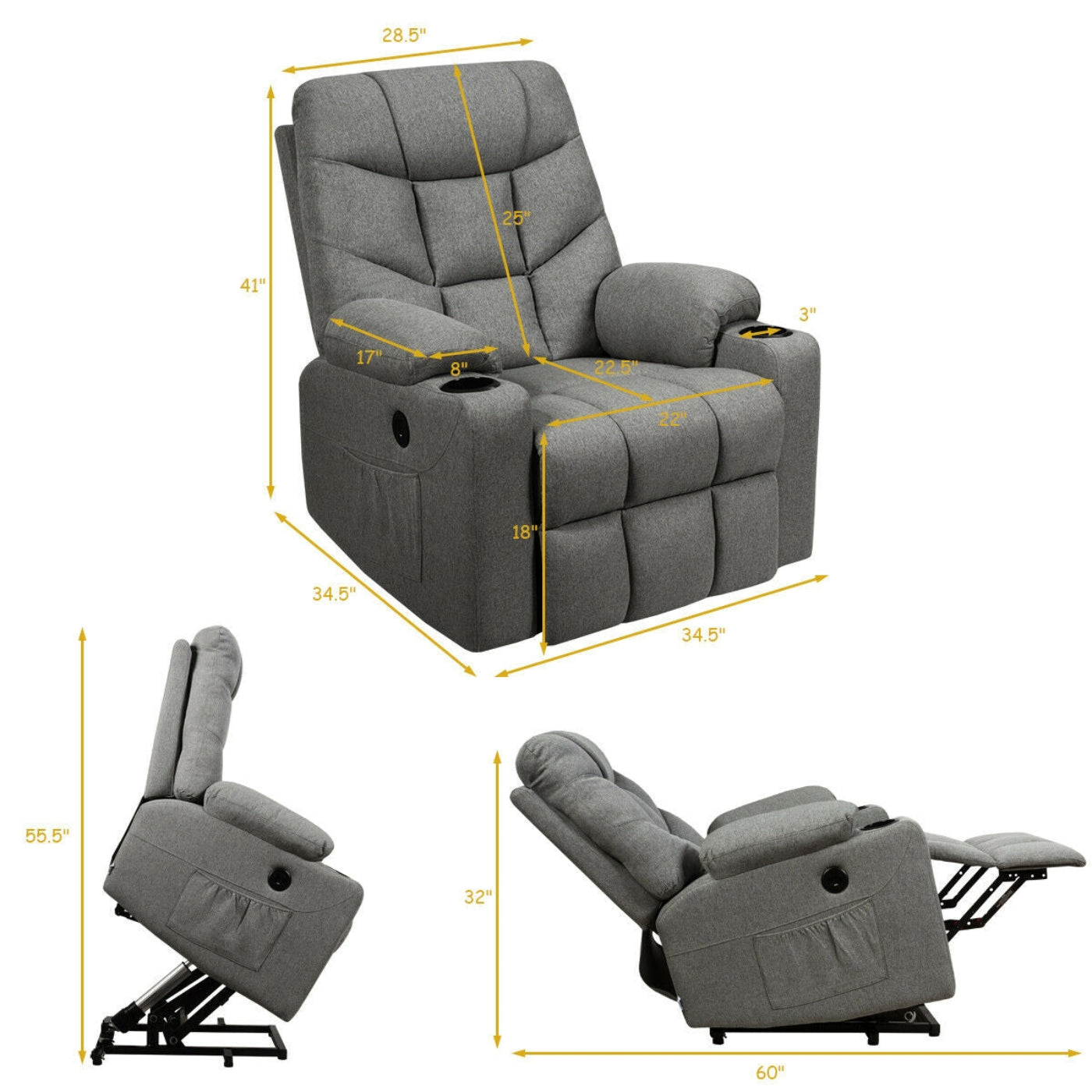 This power lift recliner chair features a lift mechanism, heat function, 8 vibrating nodes, 5 massage modes, and 2 intensity levels. Multiple massage functions for 4 body zones and lumbar heating function will eliminate the fatigue of daily life. Wide armrests, footrest, and overstuffed back and thick cushions are combined together to offer incredible support. The chair is also equipped with 2 cup holders, 2 side pockets, and a USB charging port.