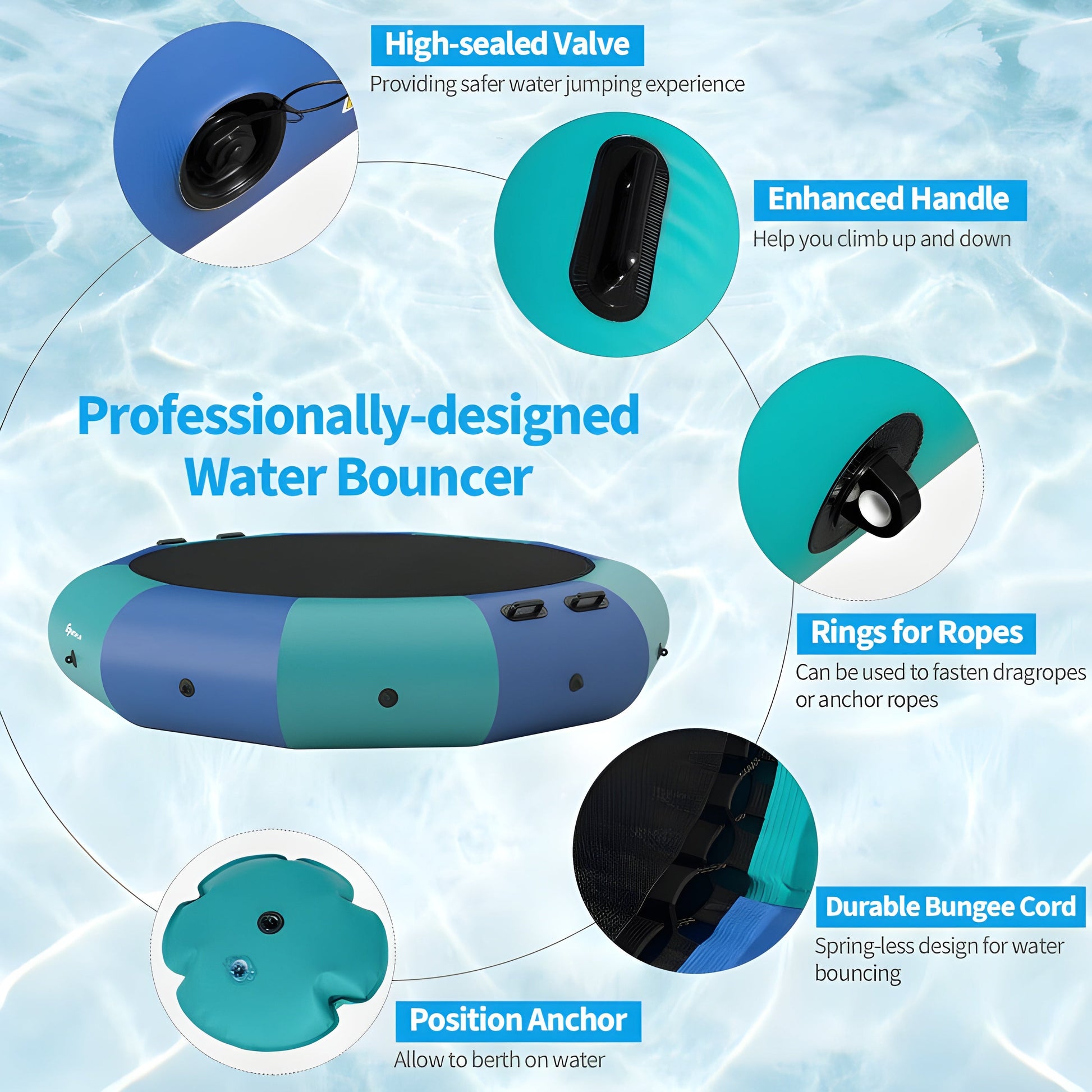 - Complete Accessories: To get you ready for a pleasant and safe water bouncing experience, we provide a 500W electric inflator, a rope ladder, 3 mooring ropes and an anchor in the package. You can fill the anchor with water or sand and fix it on the trampoline for increasing stability on water.