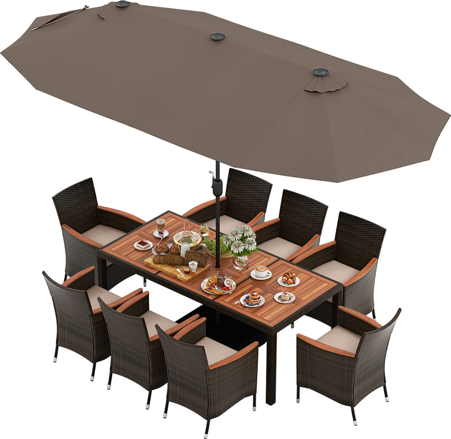 This patio dining set comes with 8 chairs, large rectangular dining table, and a 15' double-sided umbrella. The large umbrella provides ample shade for dining outdoors, and there are LED lights on each rib for soft ambient lighting at night. The hand-woven PE rattan is fade resistant and solid acacia wood provides high strength, making this dining set suitable for long-term outdoor use.