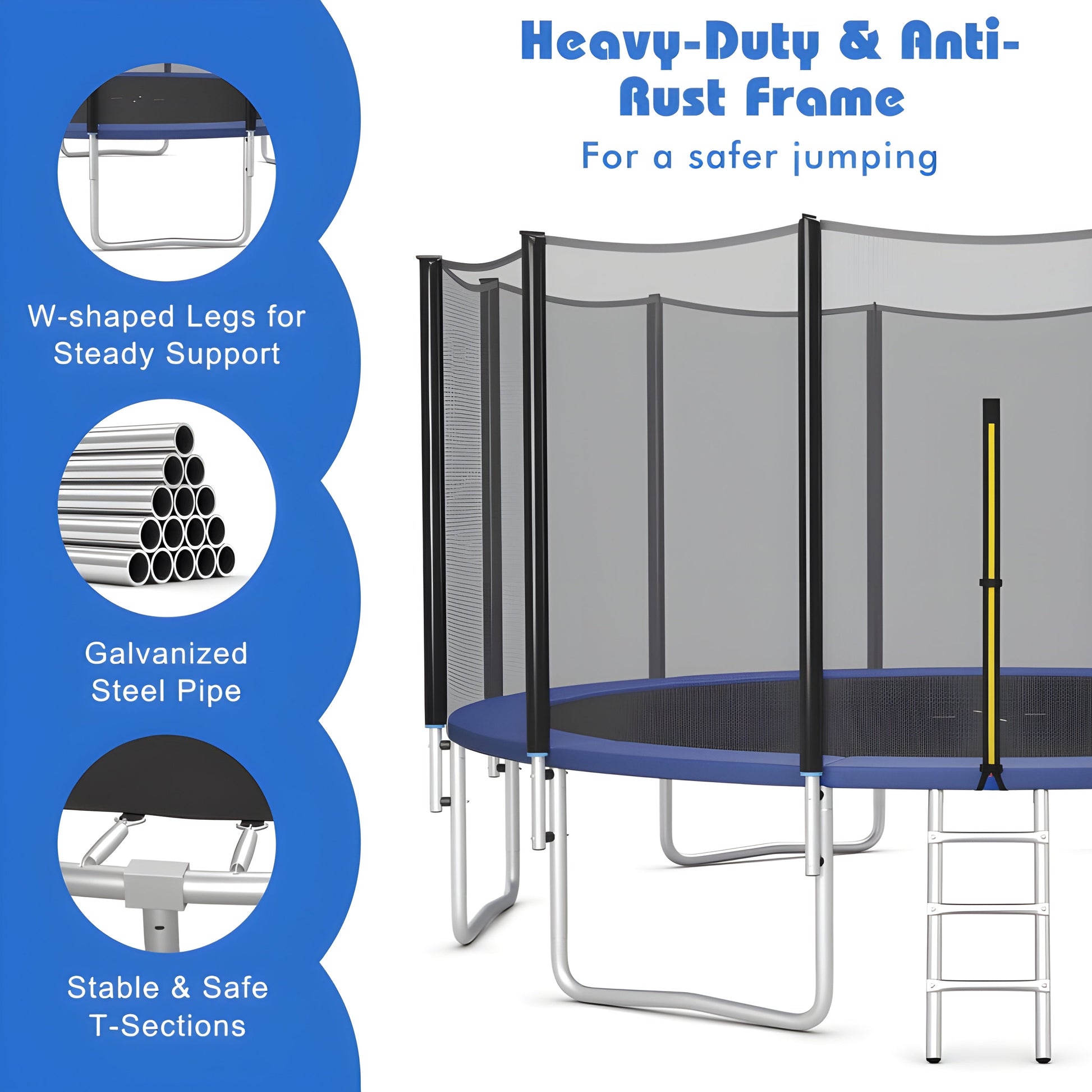 The Costway Trampoline features a durable galvanized steel frame with U-shaped legs for stability, a thickened enclosure net with foam sleeves for safety, and a high-resilient PP jumping mat for a superior bounce. Certified to meet ASTM and EN71 standards, itβs designed for easy assembly, fitness, and safe family fun with added conveniences like a ladder and secure closure system.