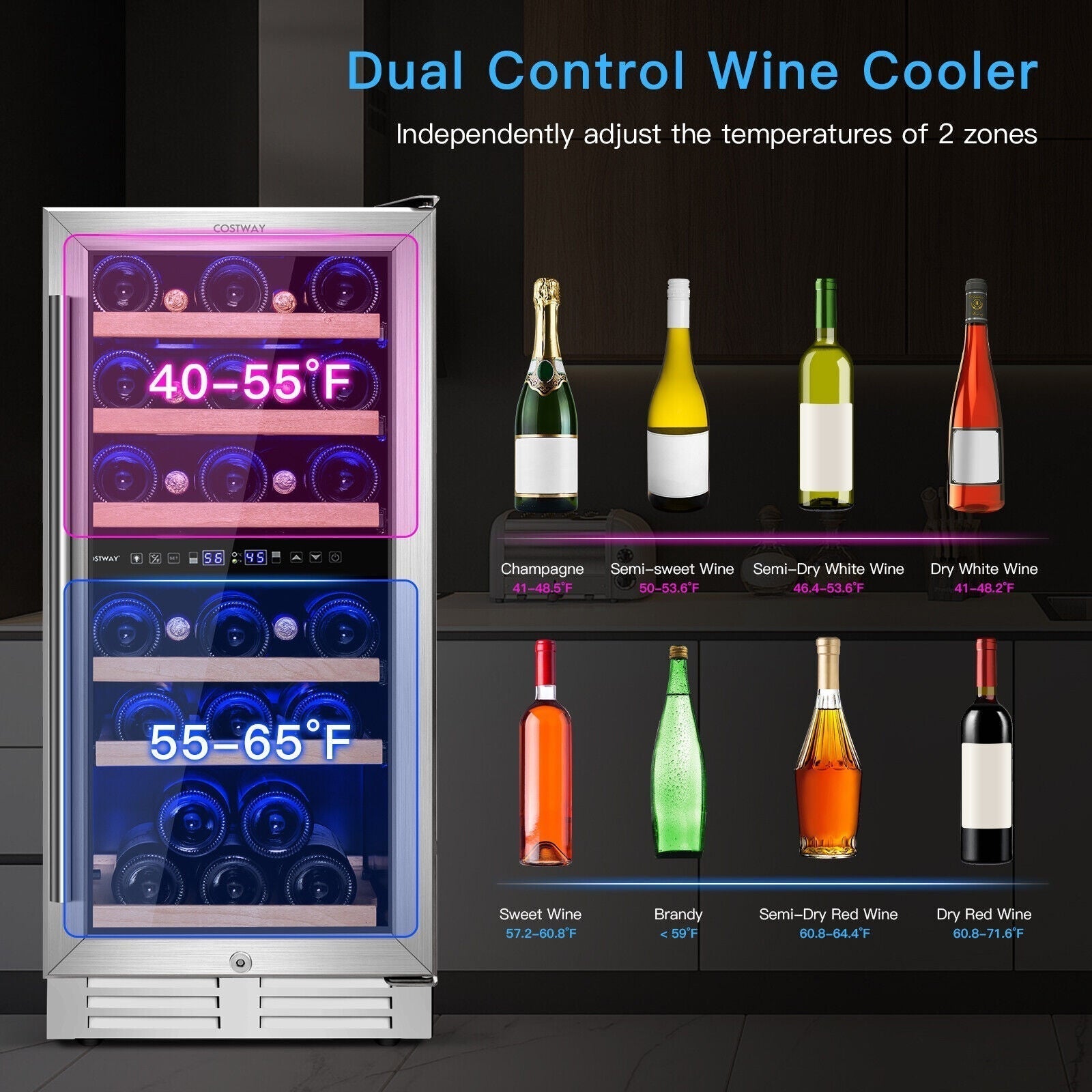 - Dual Independent Control Zones: This powerful wine cooler is able to store wines in 2 independent zones with different temperatures. The temperature of the upper zone can be adjusted from 40 to 55°F, while the lower zone can be set from 55 to 65°F. Perfect for storing rose and sparkling wines, dry/white wine, red wine, and other beverages.