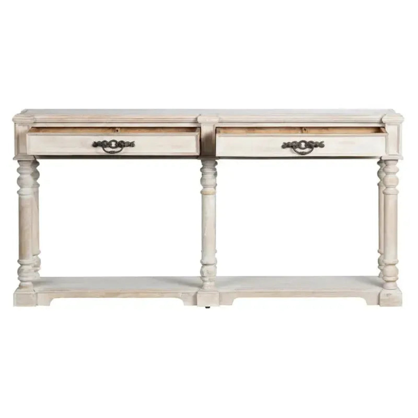 The Crestview Collection Abbott Console will look perfect along any wall or the back of a sofa. Two drawers along the top and a long bottom shelf give you open and hidden storage space to accommodate all your needs. The drawers open with black metal drawer pulls that complement the rustic tan and white wash finish. Turned legs complete the traditional style of this console table.