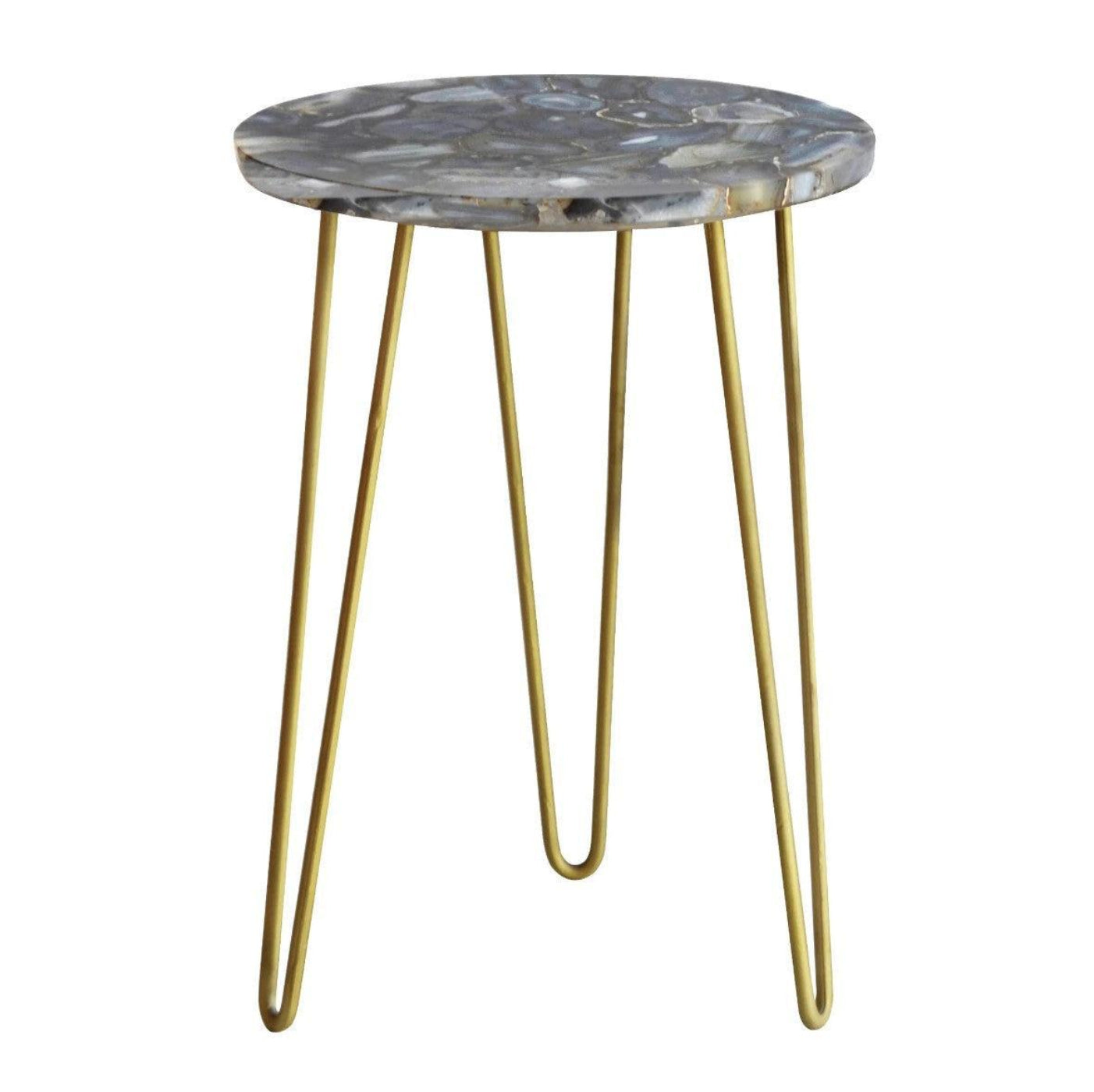 The Crestview Collection Bengal Manor Blue Agate Table this table will add interest to any room of your home. The gold tri-legs drape to the floor gracefully as they support the intricate blue agate table. The natural agate stone makes no two tables the same and its gently rounded edges showcase the intricate striation of colors flowing through the top. The table is a showpiece all on its own but could hold a lamp or flower arrangement. Suitable for any room where you want traditional elegance with a demure pop of color.