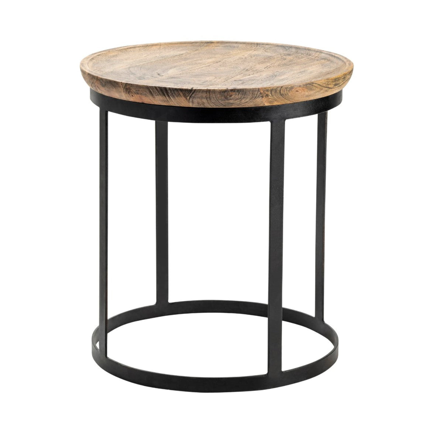 This Crestview Collection Bengal Manor Round End Table will complement the decor style of your home. This stunning end table combines a rustic style with a geometric design. A slight rim around the edge prevents items from falling off and adds a subtle finishing touch. The end table has a black metal base contrasted by the light-brown top made of mango wood.