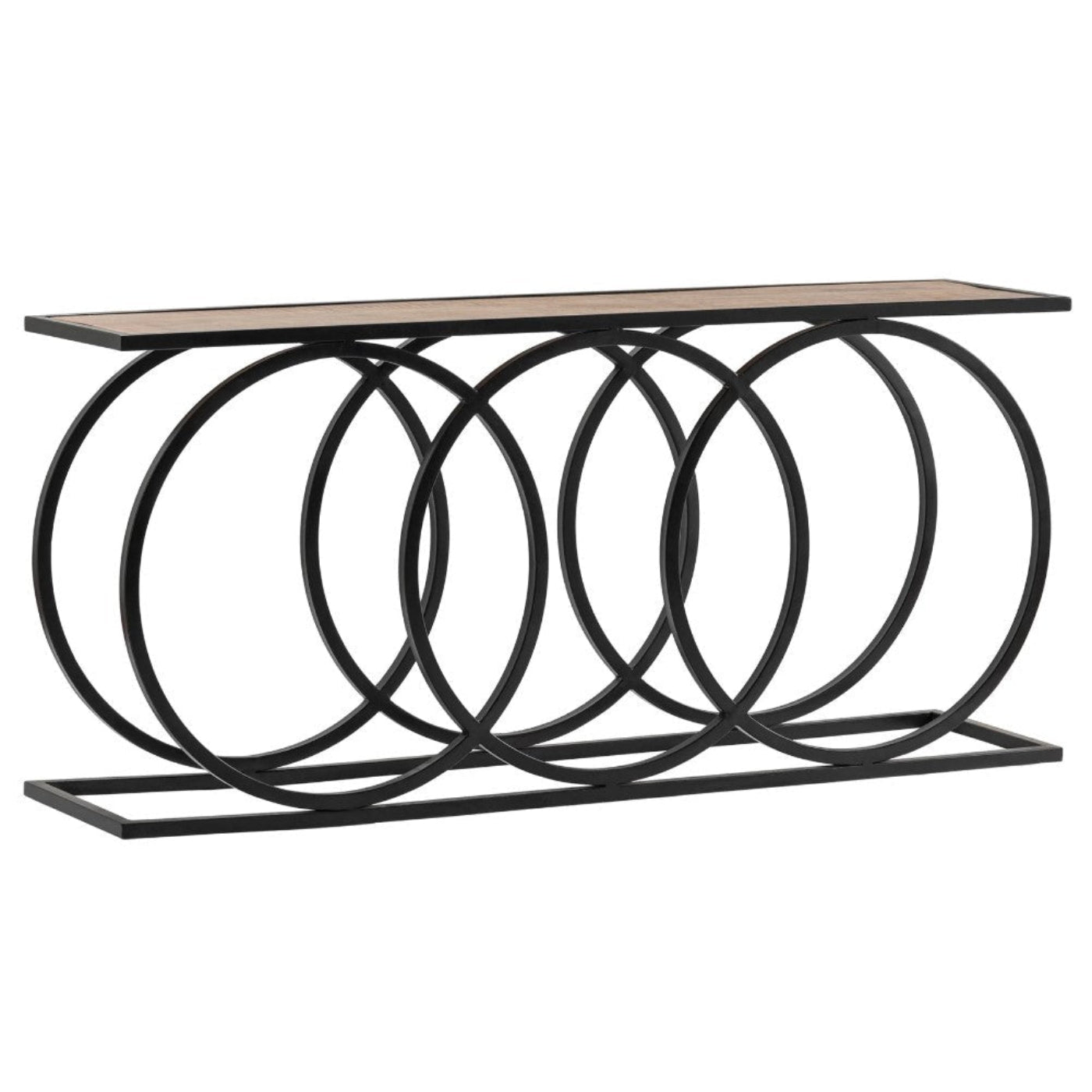 Striking 3-circle metal base design paired with a solid mango wood top.