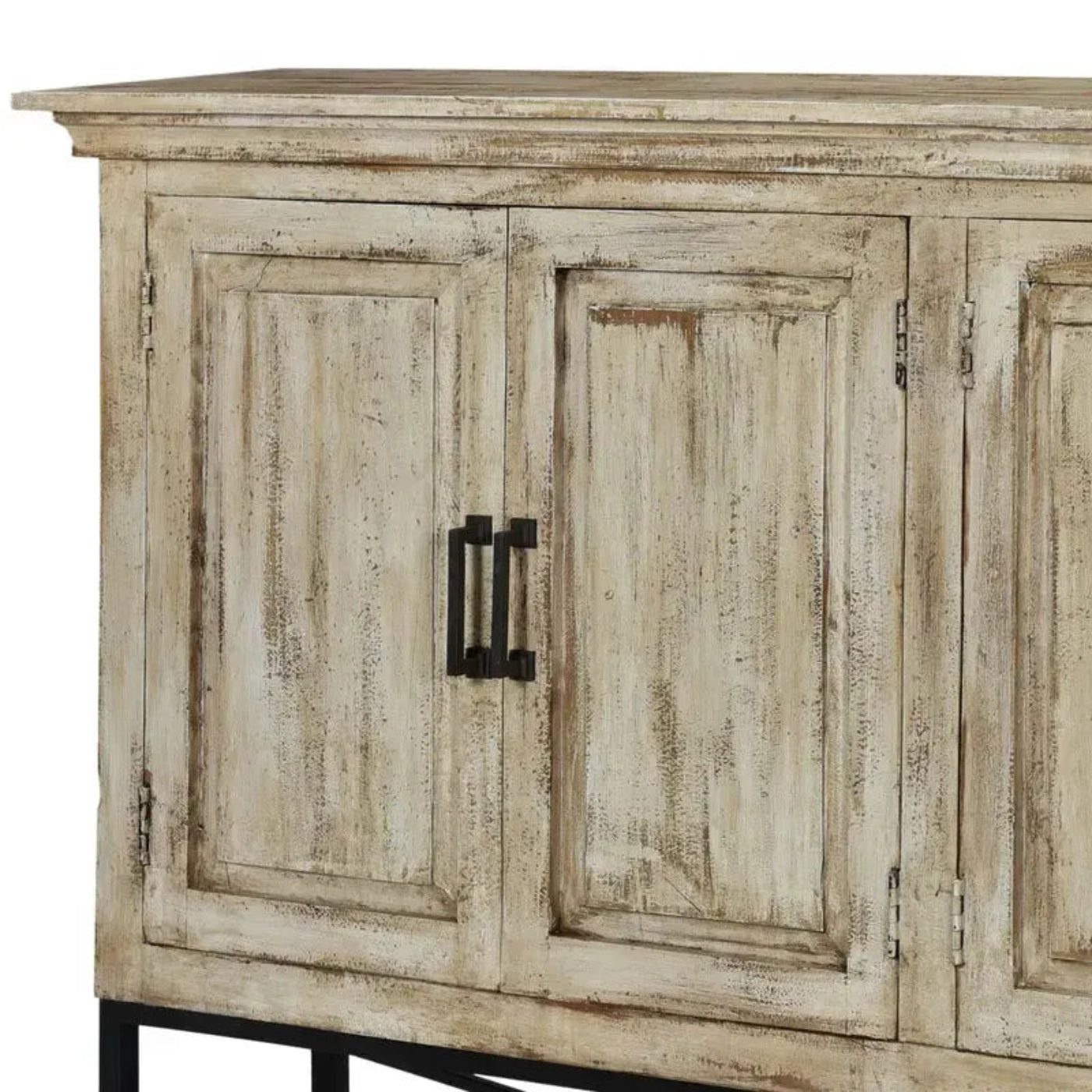 The Crestview Collection Bengal Manor Distressed White Sideboard is made of mango wood for a sturdy piece that will last for years. The sideboard closes with four cabinet doors. Finished in distressed white, this sideboard sits atop a black wrought iron base and is accented with black cabinet handles. A storage shelf and cable management hole allow this piece to be used as a media console or buffet as well as a sideboard.