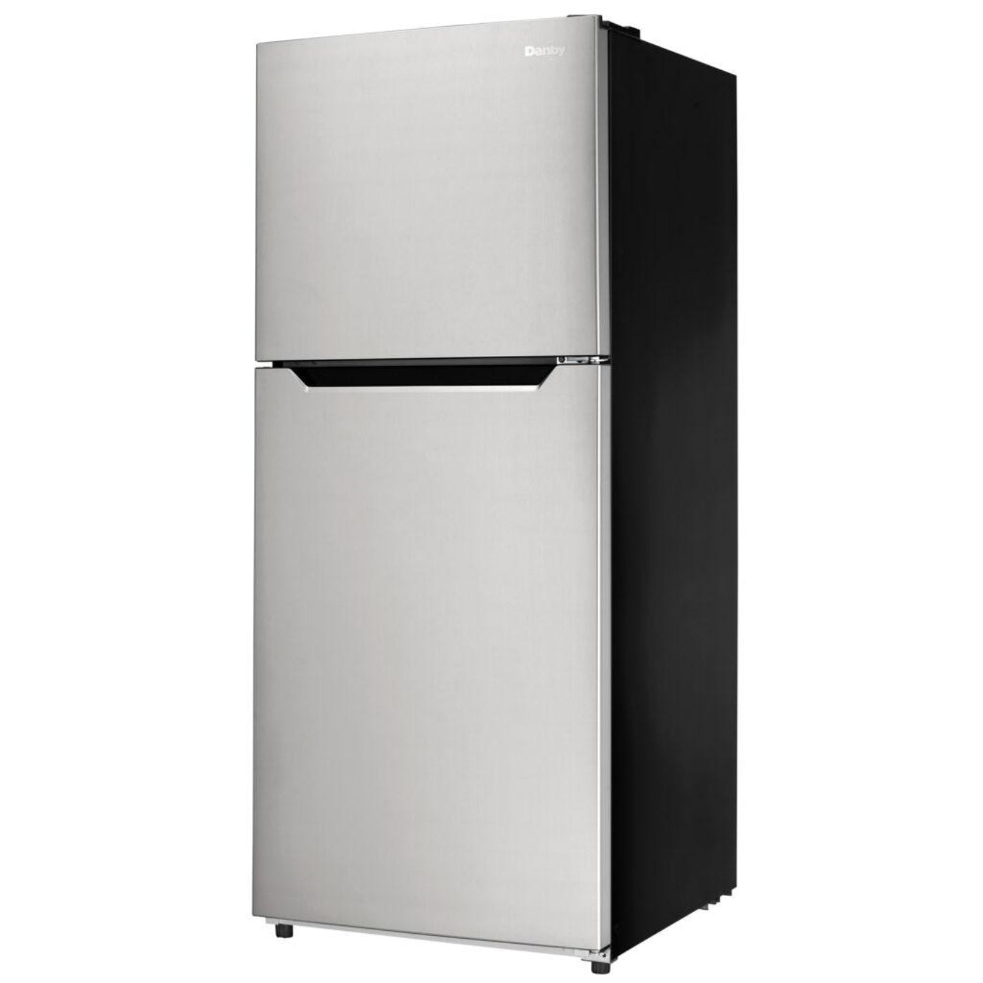 A: A 10.1 cu. ft. top mount apartment‑size fridge with a stainless steel look.