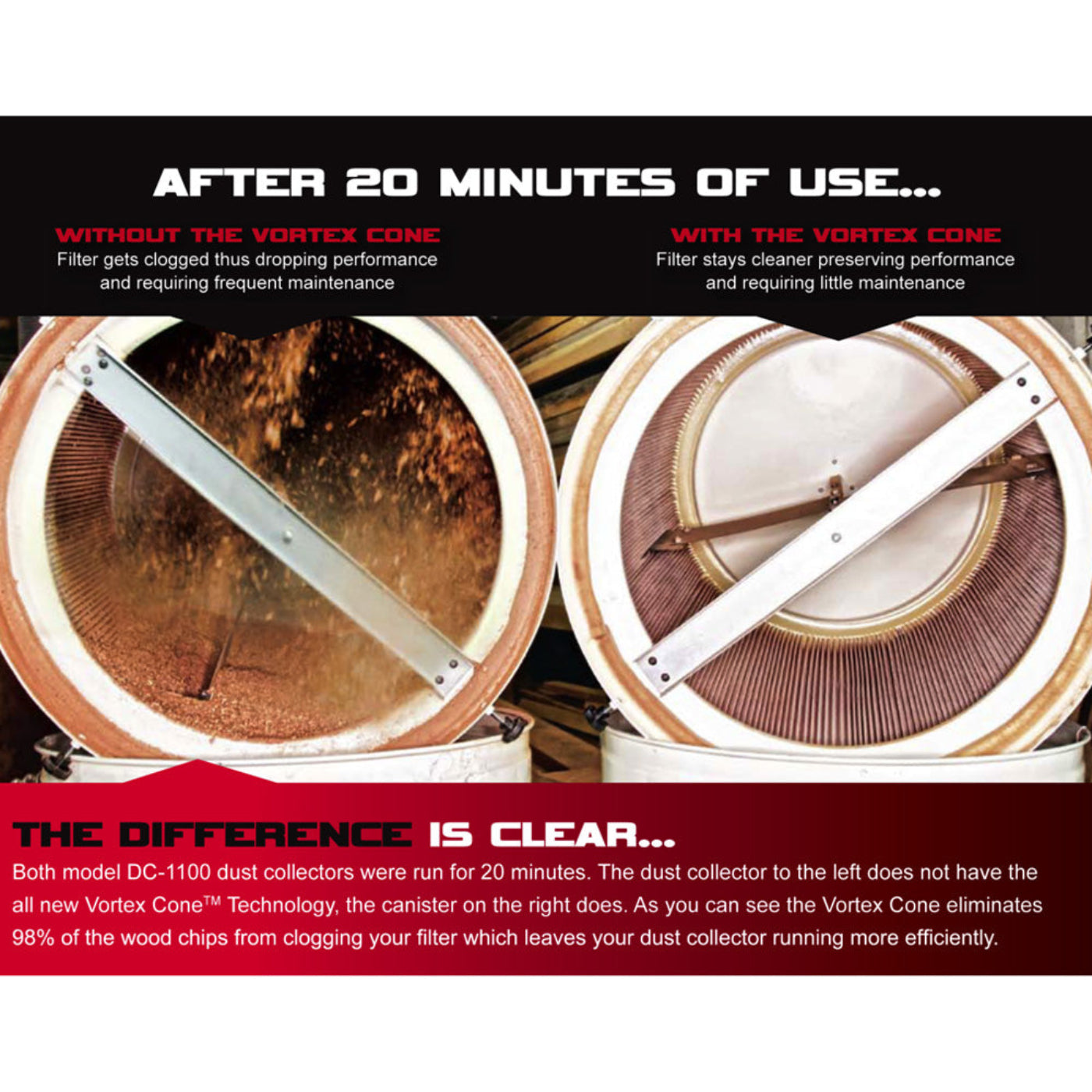 JET DC-1100VX features the exclusive Vortex Cone which improves chip separation to prevent clogging of the filter, and increases packing efficiency of the collector bag. The high air velocity (CFM) stands up to any competitive specifications, and the industrial controls are designed for years of durable use. Collection bags have an elastic band for fast installation and removal. Swivel casters offer maneuverability within the shop.