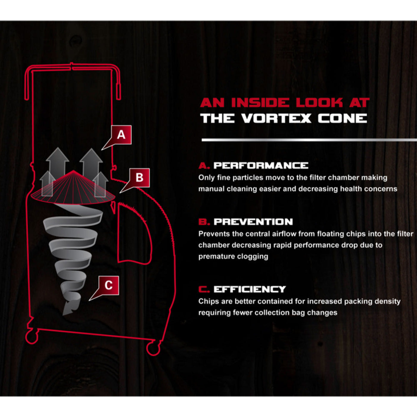 A: Features Vortex Cone technology to separate chips and extend filter life.