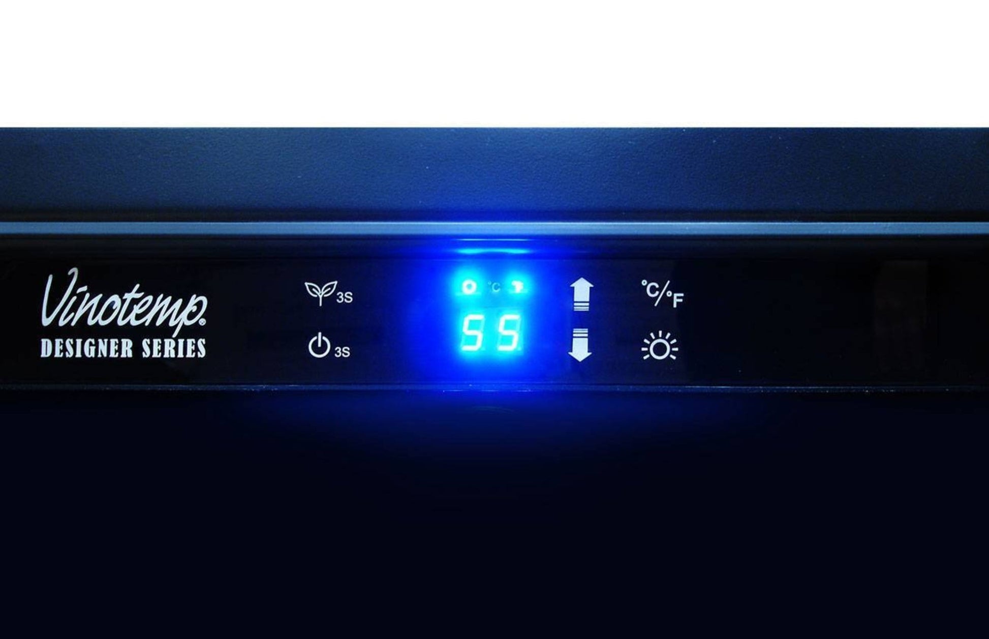 The Vinotemp Designer Series 15-inch Beverage Cooler is an essential for those who love to entertain. Equipped with front exhaust, this beverage cooler is designed to fit seamlessly in existing cabinetry. Outfitted with 3 sturdy tempered glass shelves with a black lip, there’s plenty of room for an assortment of your favorite drinks. The easy to use digital control panel makes adjusting the temperature simple while providing peace of mind that your beverages are always ready to be enjoyed. The blue LED lighting illuminates the cooler’s contents behind a seamless stainless steel door, making this beverage cooler an aesthetically pleasing addition to any room. This beverage cooler holds approximately 86 12 oz. cans. Beautiful and functional, this beverage cooler is sure to be the centerpiece of get-togethers for years to come.