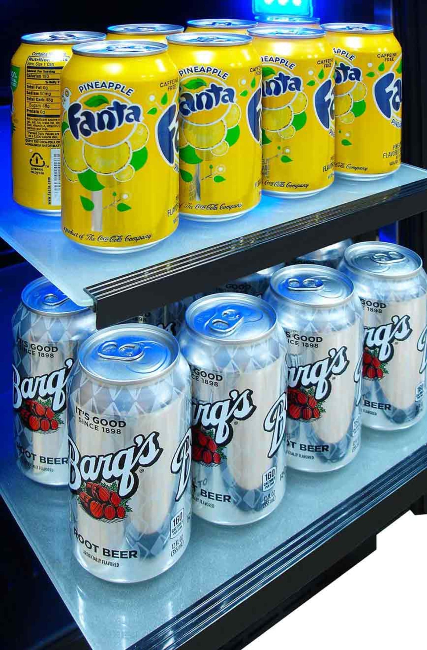 A: It accommodates cans and bottles, with adjustable shelving for flexible storage options.