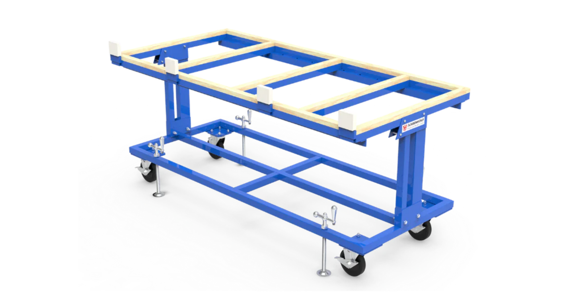 Heavy-duty dolly designed for transporting work tables and heavy slabs.