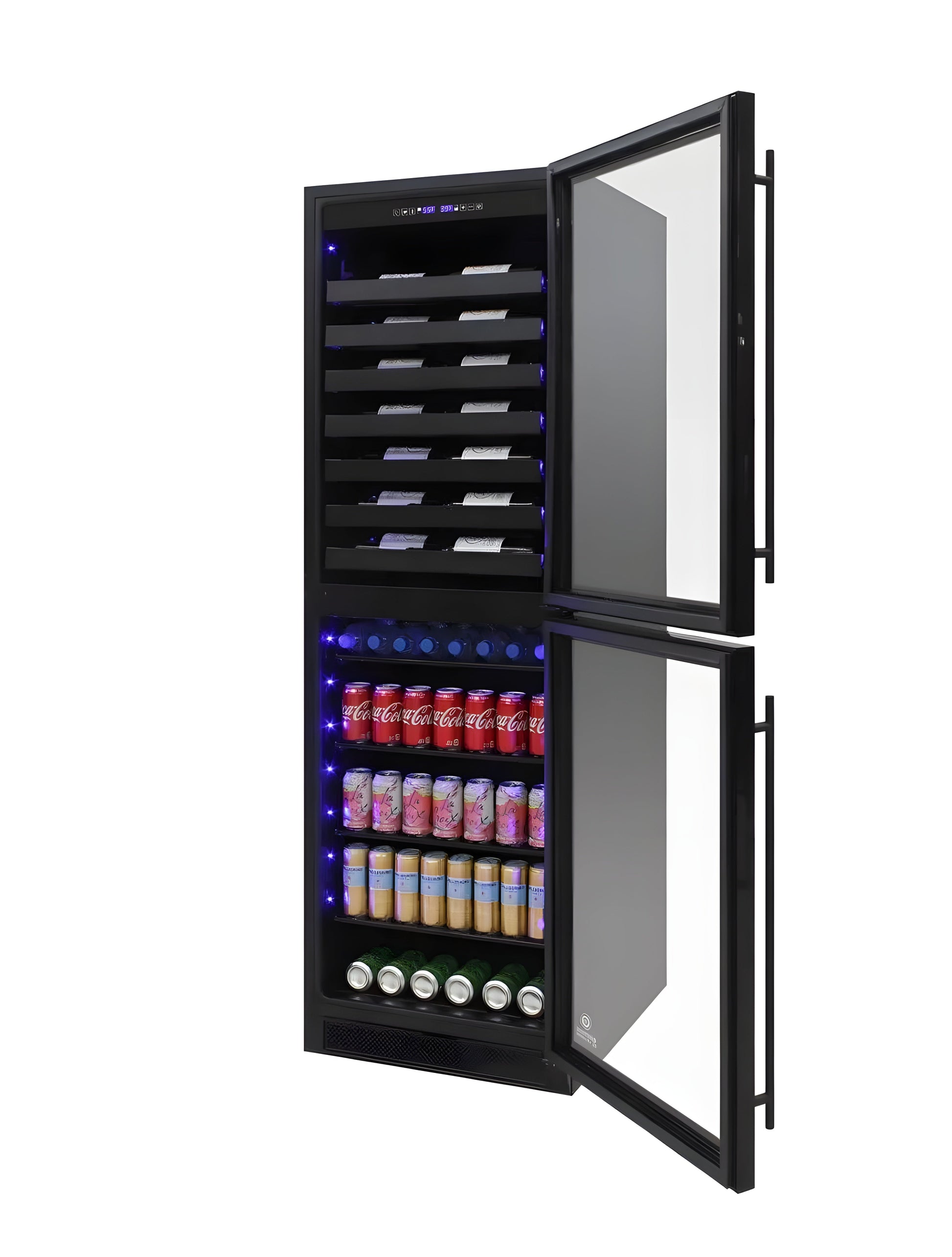 Vinotemp's Dual-Zone Wine & Beverage Center brings an element of class and elegance to any room. This premium wine & beverage cooler will allow you to store your collection in the optimal conditions so that your wine and beverages can be kept at respective temperatures. An easy-to-use digital control panel with LED readout allows you to set the individual cooling zones at two different temperatures to ensure that your wine bottles and beverage cans are maintained properly. This unit features two dual-paned glass doors with recessed handle that separate the wine storage in the upper zone and beverage storage in the lower zone. Outfitted with 7 Ouzo™ gliding wire racks with black lip and 4 tempered glass shelves, this wine & beverage cooler can hold approximately 98 bottles and 200 cans in two separate cooling zones. Frameless cabinet with all-glass technology and dual-paned glass doors give a stylish look to this cooler while providing you with easy access to your favorite wine and beverages. This attractive and modern wine & beverage cooler is designed to be a worthy home for all of your finest collections.