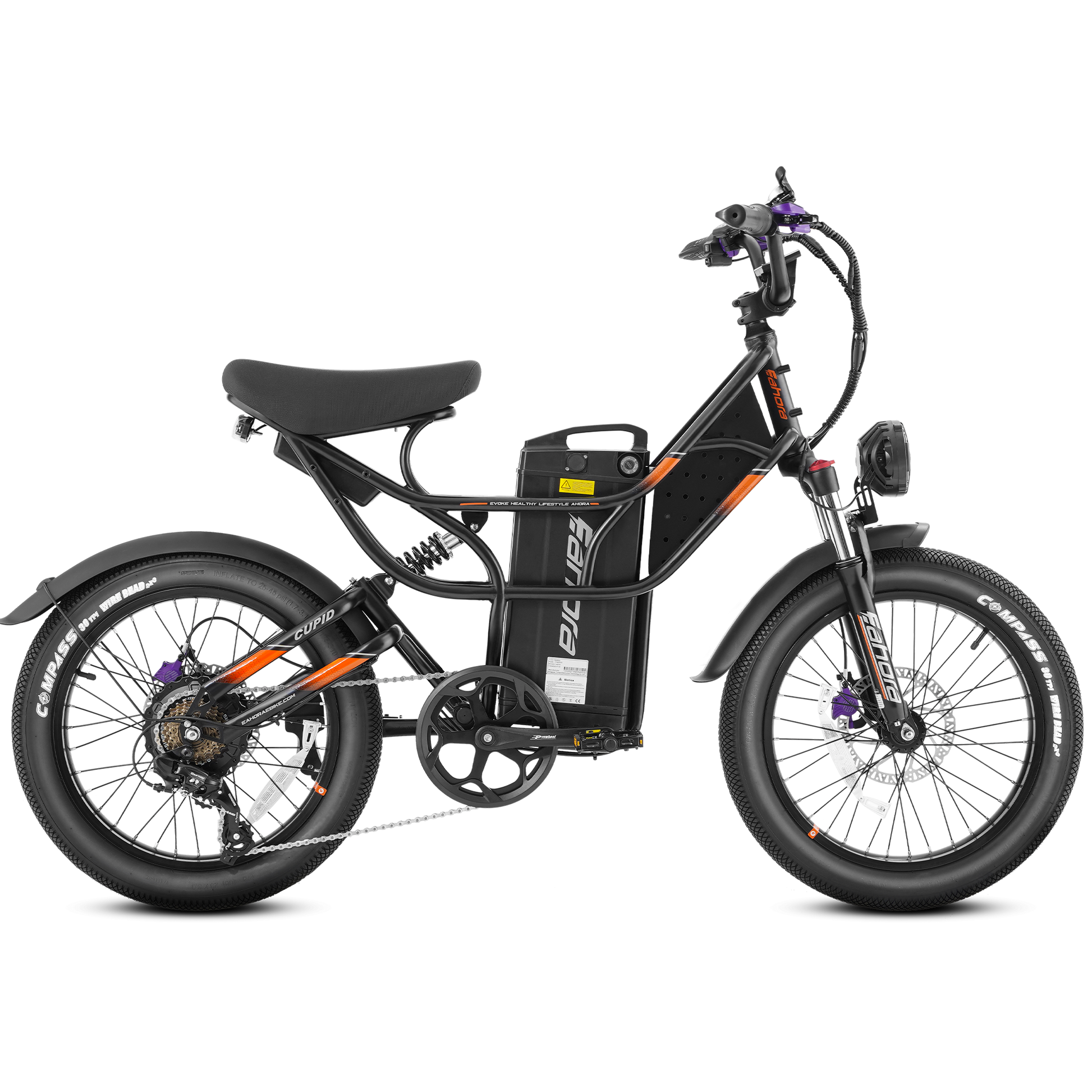 Full Suspension System: Designed with an adjustable front fork and rear shock absorber rated at 750 lbs, the Cupid ensures a smooth and stable ride across various terrains, effectively absorbing shocks and enhancing rider comfort.